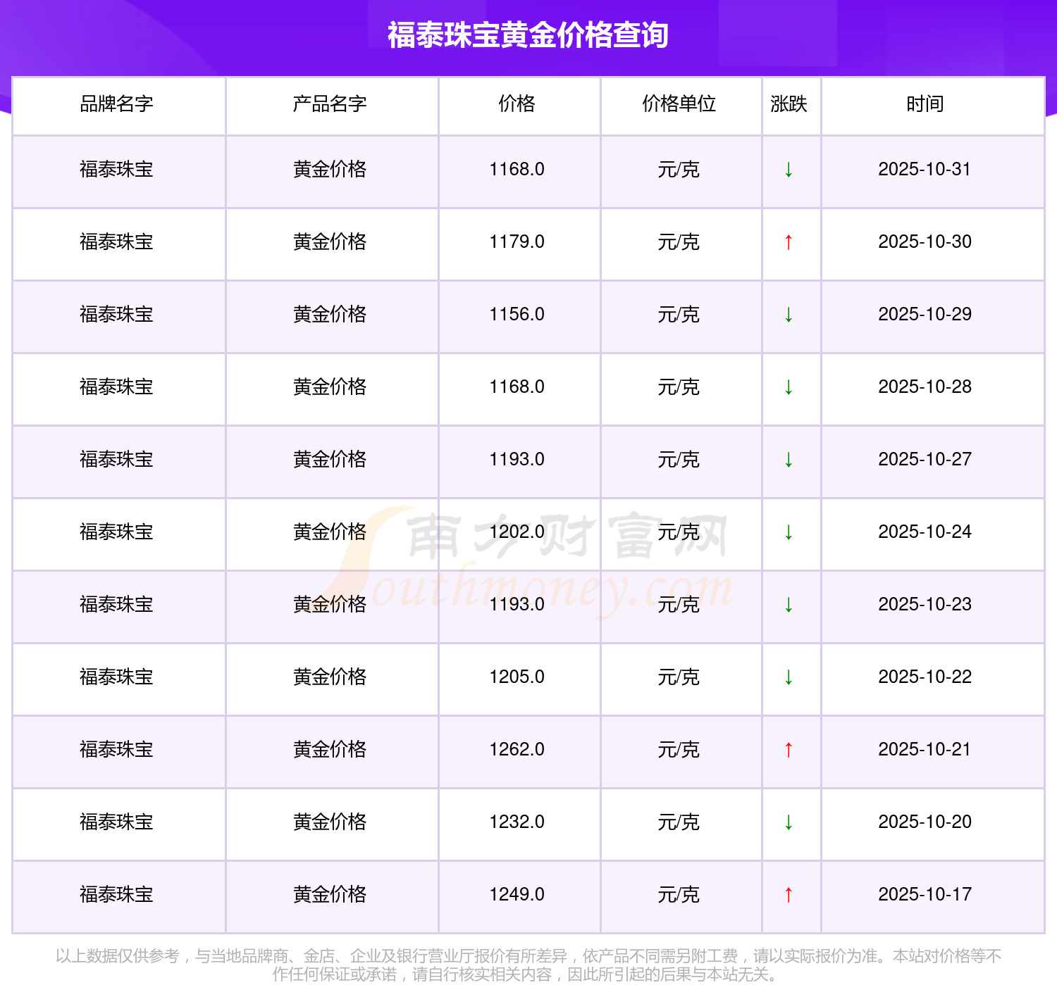 今日福泰珠寶黃金價(jià)格最新為1168.0元/克。