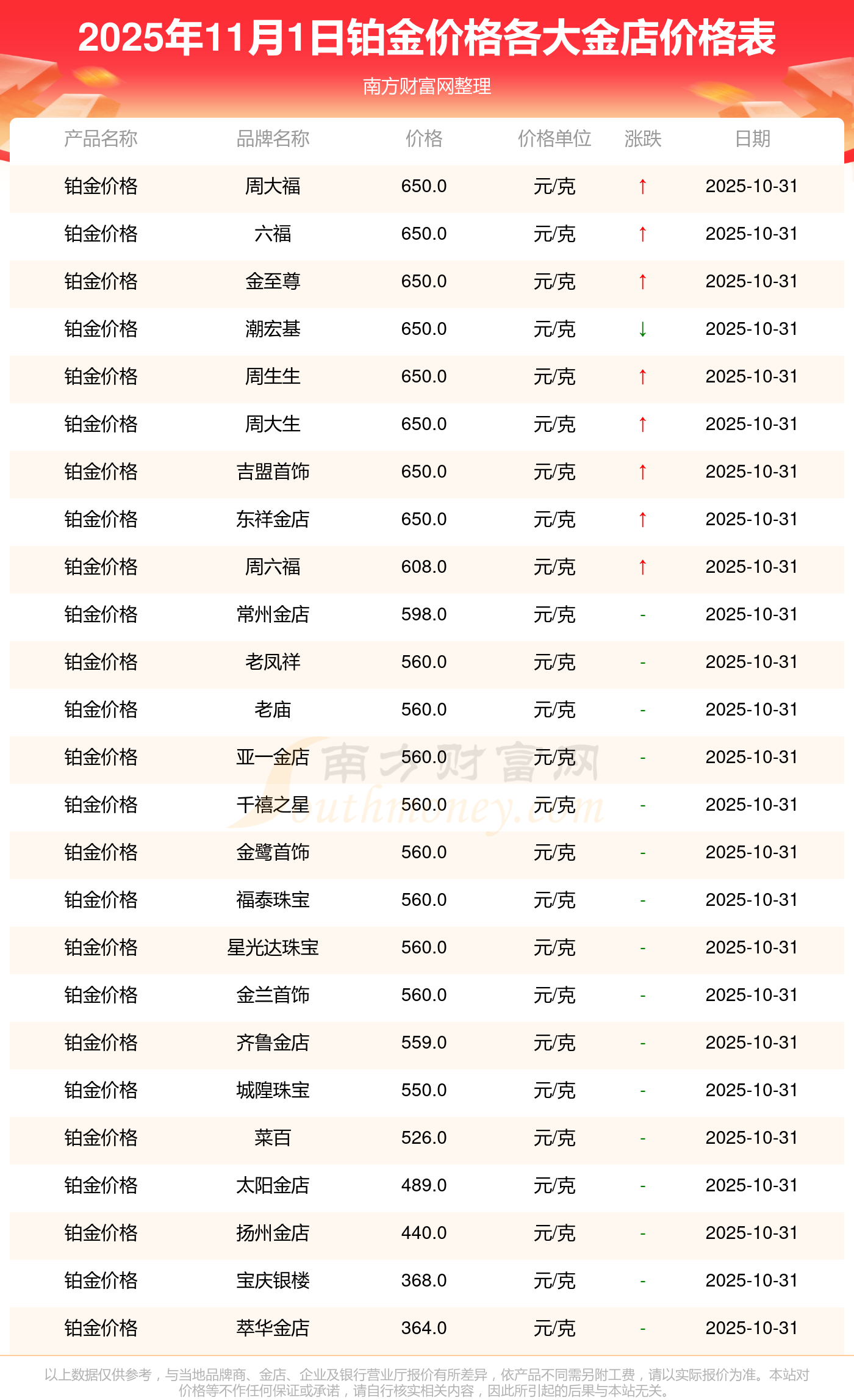2025年11月1日,周大福、周大福、周大福、周大福、周大福、周大福、周大福、老鳳祥、老鳳祥、老鳳祥、周六福等各大金店品牌鉑金價(jià)格今日價(jià)格如下:周大福1198.0元/克、周大福650.0元/克、周大福1198.0元/克、周大福44660.0、周大福18640.0、周大福40080.0、周大福1058.0元/克、老鳳祥1200.0元/克、老鳳祥560.0元/克、老鳳祥1200.0元/克、周六福1135.0元/克。