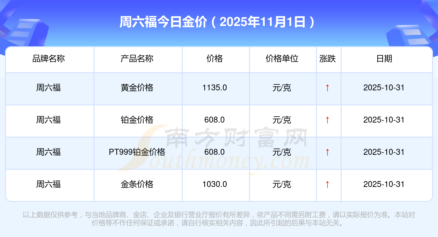 現(xiàn)在周六福黃金價(jià)格是多少錢1克_2025年周六福今日金價(jià)是多少錢一克,最新周六福查詢,2025年11月1日周六福鉑金價(jià)格現(xiàn)在每克多少錢?最新周六福鉑金價(jià)格報(bào)價(jià)公布,一起來看看吧!