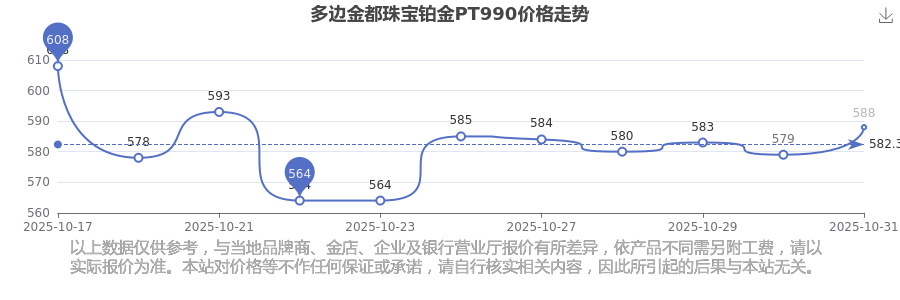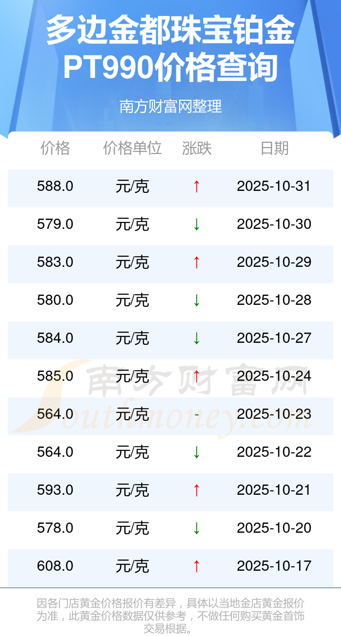 今日多邊金都珠寶所公布的 鉑金PT990最新價(jià)格為588.0元/克。