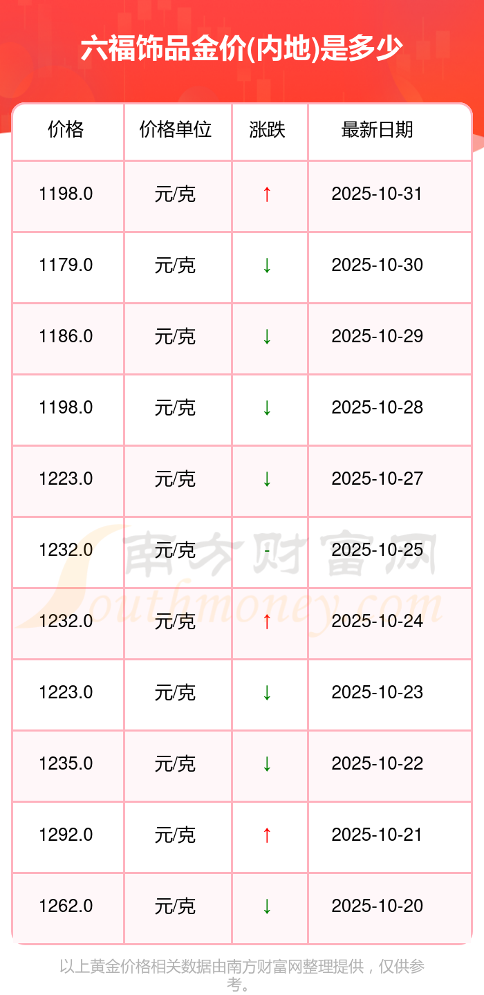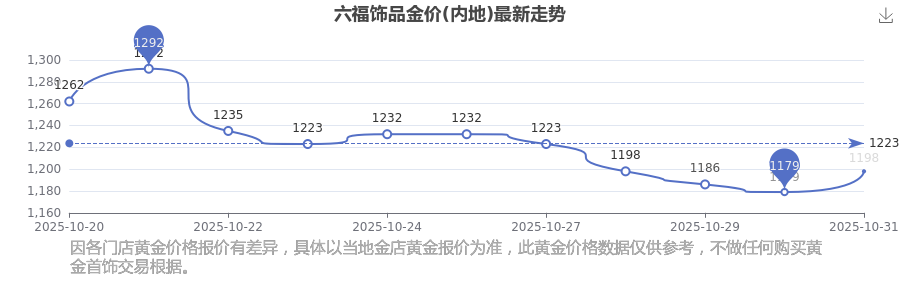 六福今日 飾品金價(jià)(內(nèi)地)的最新市場(chǎng)行情價(jià)為1198.0元/克。