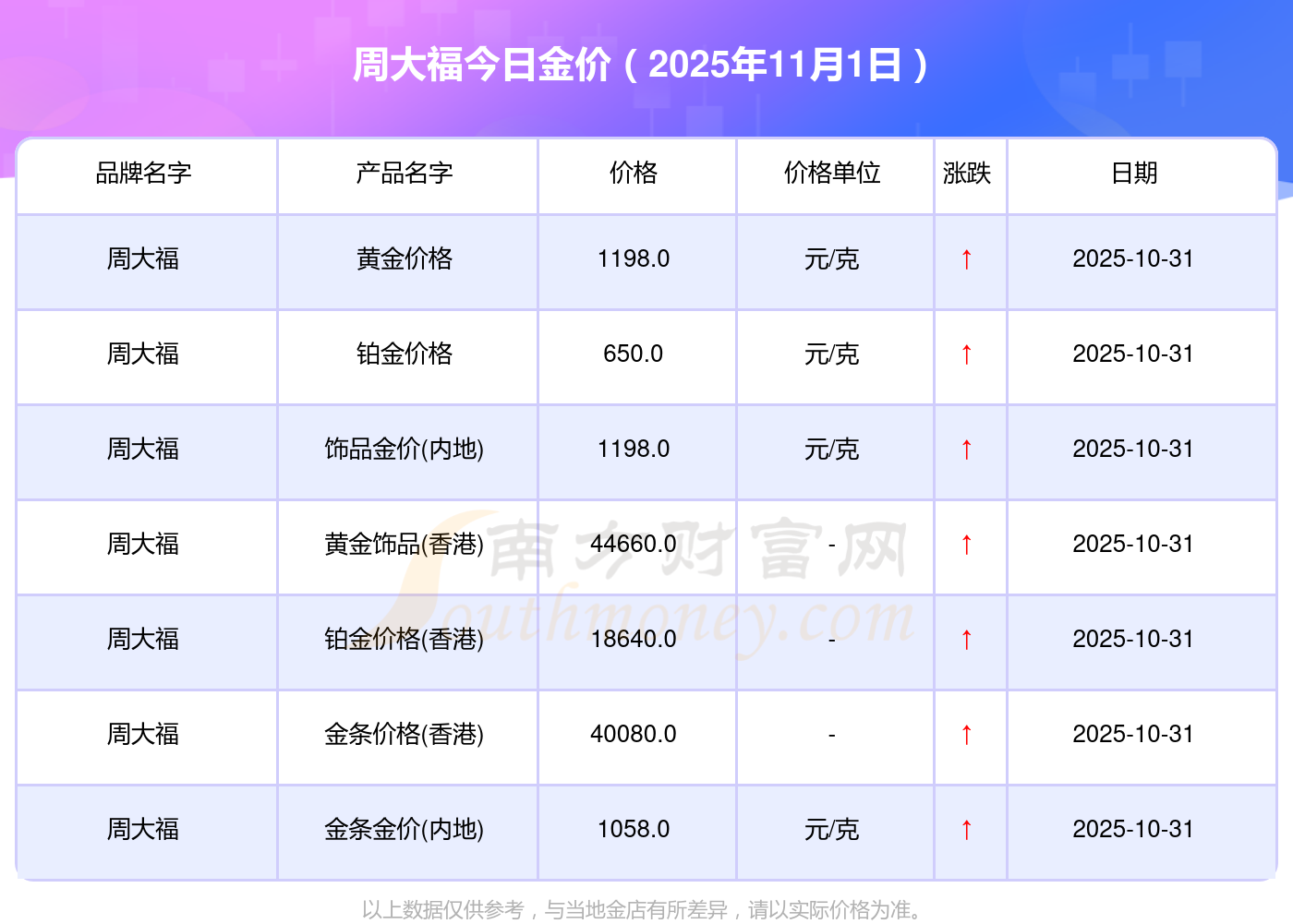 現(xiàn)在周大福黃金價格是多少錢1克_2025年周大福今日金價是多少錢一克,最新周大福查詢,2025年11月1日周大福金條金價(內(nèi)地)現(xiàn)在每克多少錢?最新周大福金條金價(內(nèi)地)報價公布,一起來看看吧!