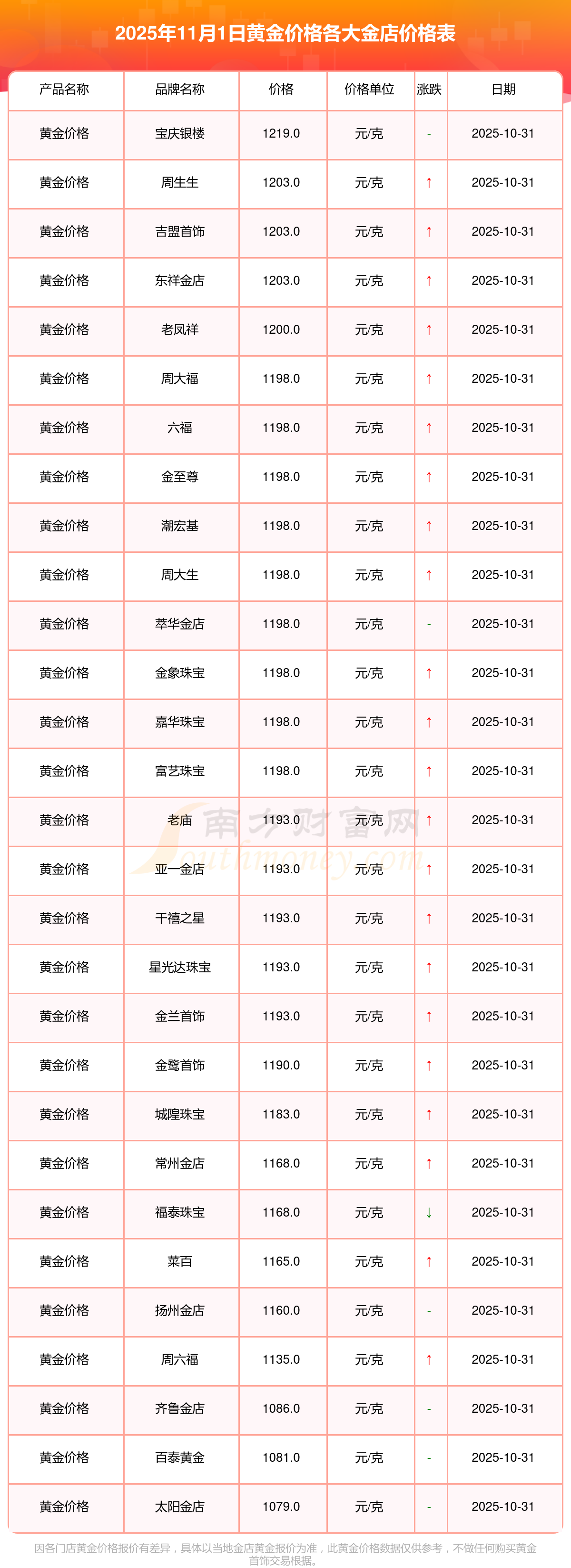 今天是2025年11月1日,周大福、周大福、周大福、周大福、周大福、周大福、周大福、老鳳祥、老鳳祥、老鳳祥、周六福等各大金店品牌黃金價(jià)格最新價(jià)格如下:周大福1198.0元/克、周大福650.0元/克、周大福1198.0元/克、周大福44660.0、周大福18640.0、周大福40080.0、周大福1058.0元/克、老鳳祥1200.0元/克、老鳳祥560.0元/克、老鳳祥1200.0元/克、周六福1135.0元/克。