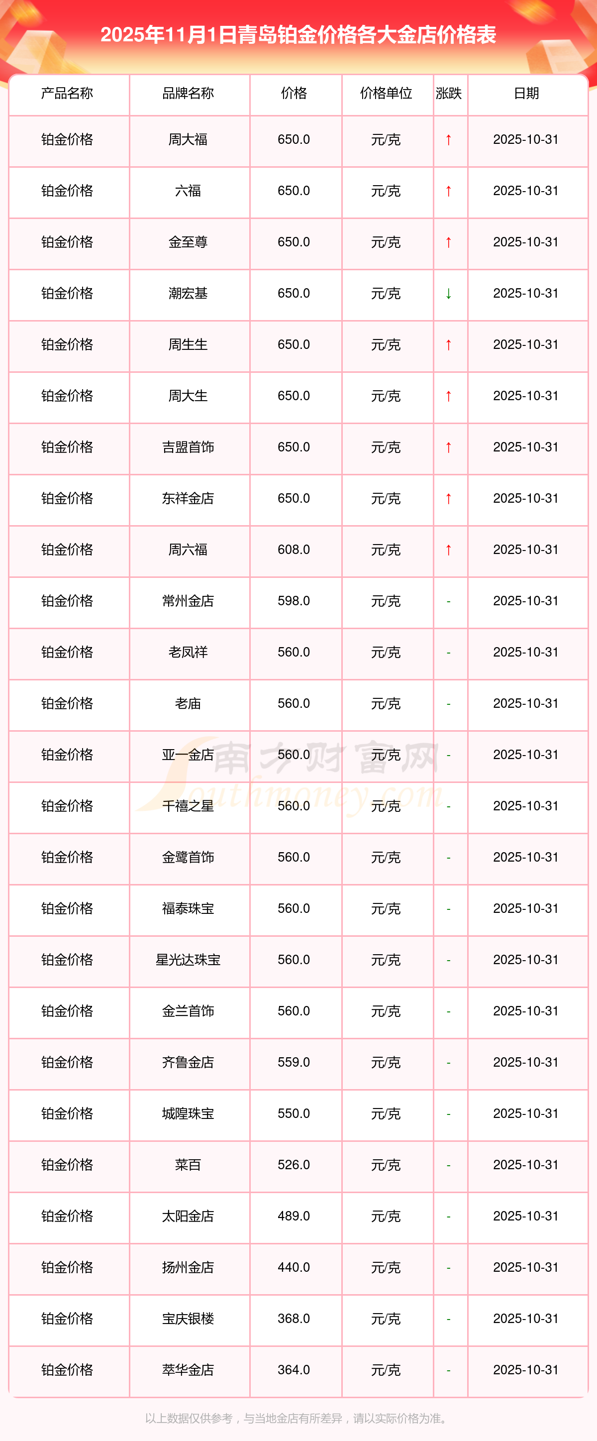 2025年11月1日青島各大金店鉑金價(jià)格最新價(jià)格查詢來(lái)了:周大福1198.0元/克,周大福650.0元/克,周大福1198.0元/克,周大福44660.0,周大福18640.0,周大福40080.0,周大福1058.0元/克,老鳳祥1200.0元/克,老鳳祥560.0元/克,老鳳祥1200.0元/克,周六福1135.0元/克。