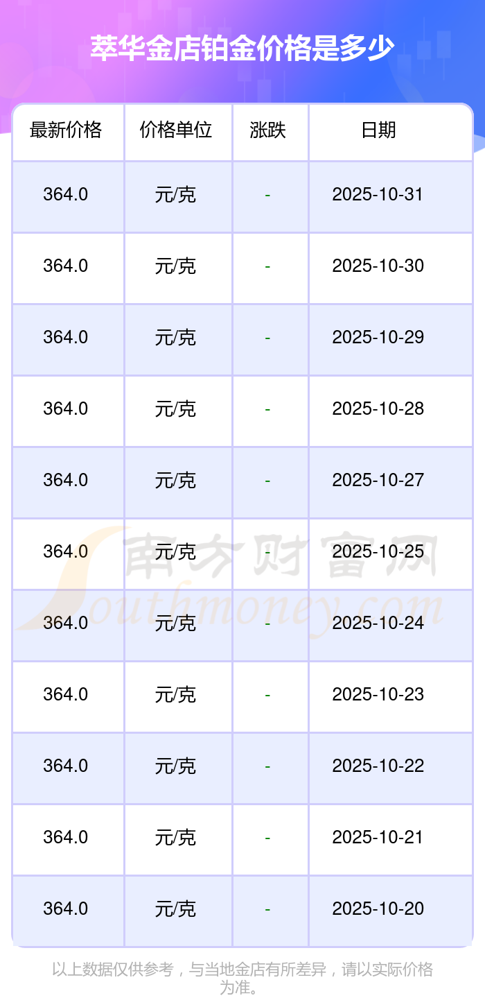 2025年11月1日萃華金店鉑金價格為364.0元/克。