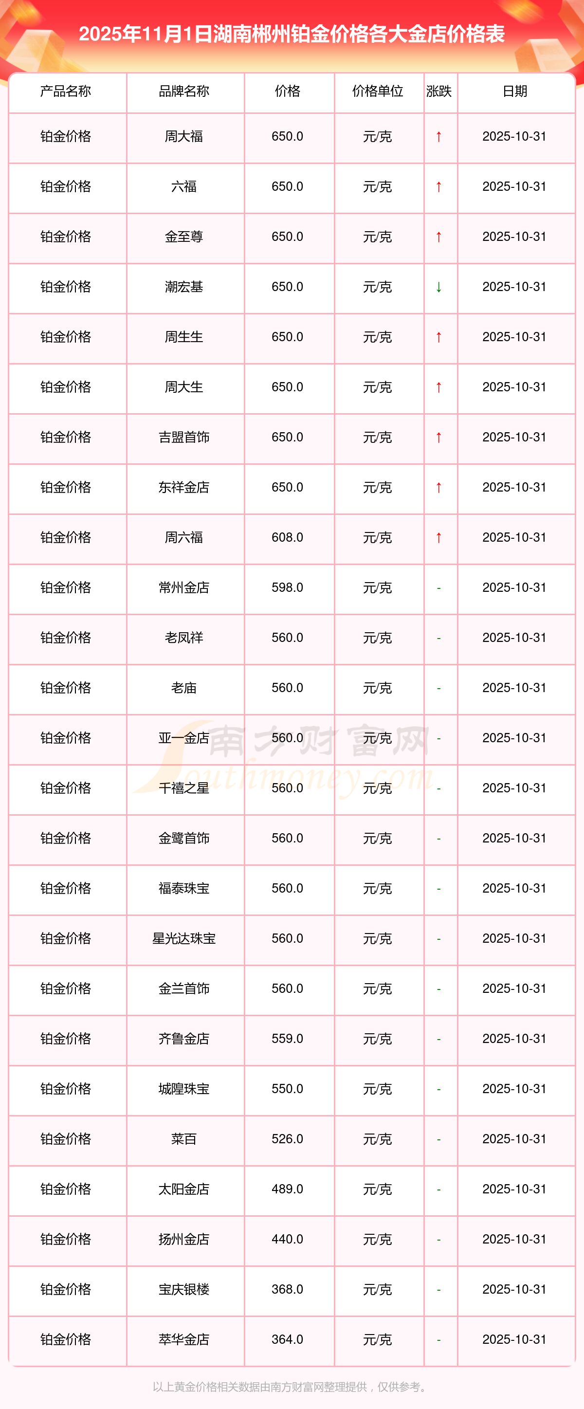 2025年11月1日,湖南郴州周大福、周大福、周大福、周大福、周大福、周大福、周大福、老鳳祥、老鳳祥、老鳳祥、周六福等各大金店品牌鉑金價格今日價格如下:周大福1198.0元/克、周大福650.0元/克、周大福1198.0元/克、周大福44660.0、周大福18640.0、周大福40080.0、周大福1058.0元/克、老鳳祥1200.0元/克、老鳳祥560.0元/克、老鳳祥1200.0元/克、周六福1135.0元/克。