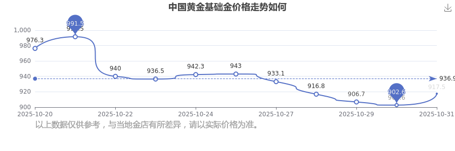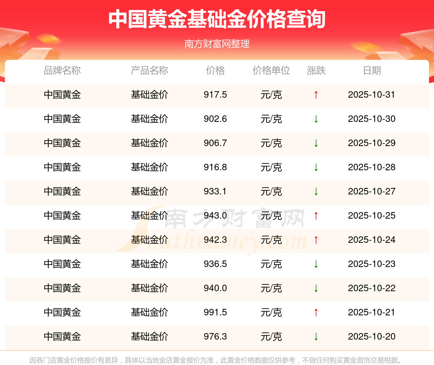 今日中國(guó)黃金 基礎(chǔ)金價(jià)最新的克重售價(jià)為917.5元/克。