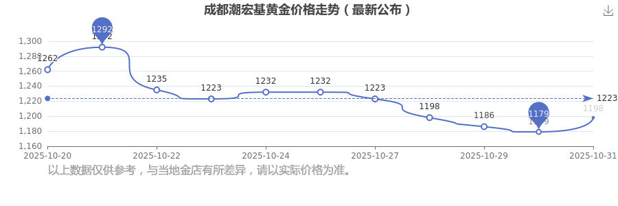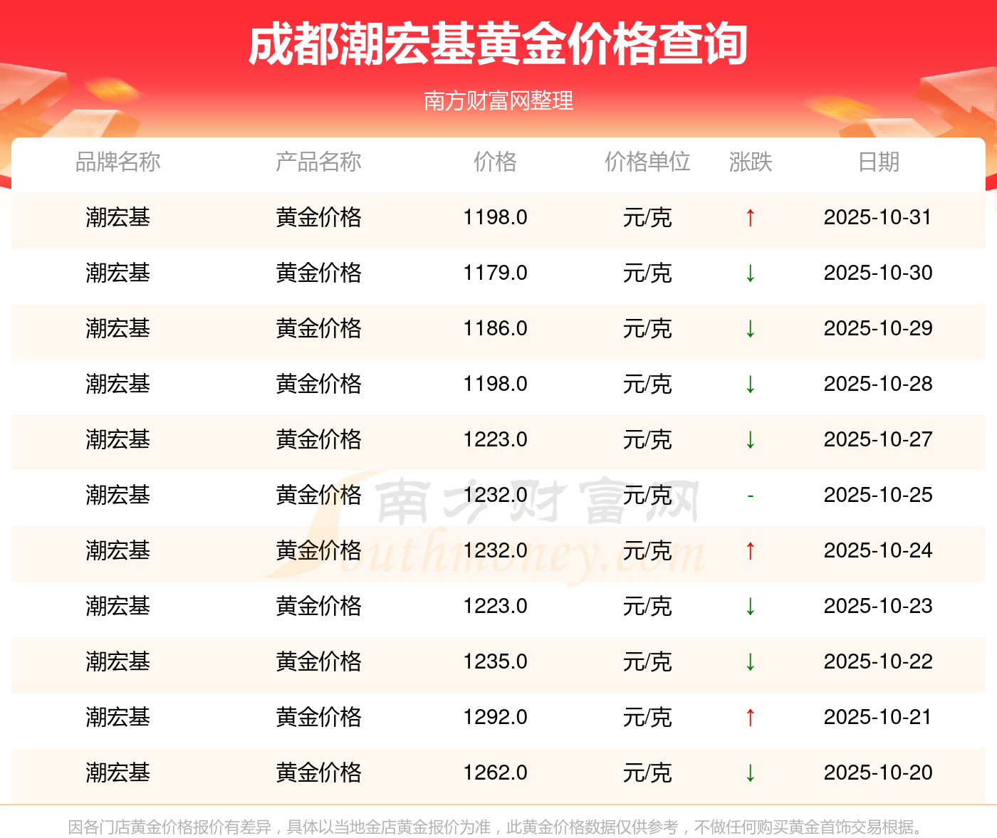 于 2025年11月1日,成都潮宏基黃金價格的克價為1198.0元/克。