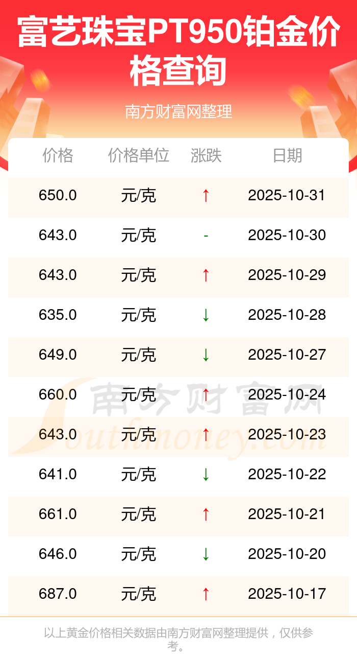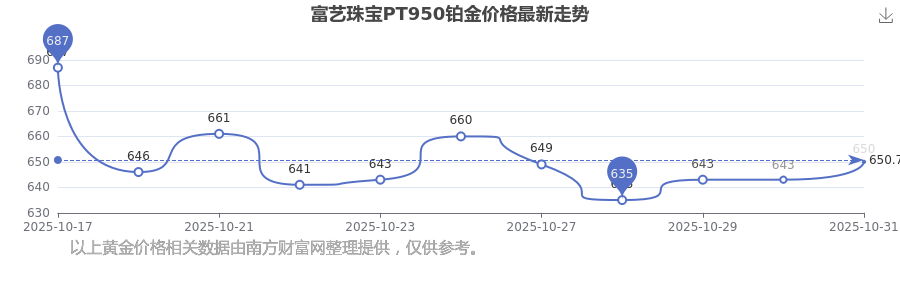 最新數(shù)據(jù)表明,富藝珠寶今日 PT950鉑金價格為650.0元/克。
