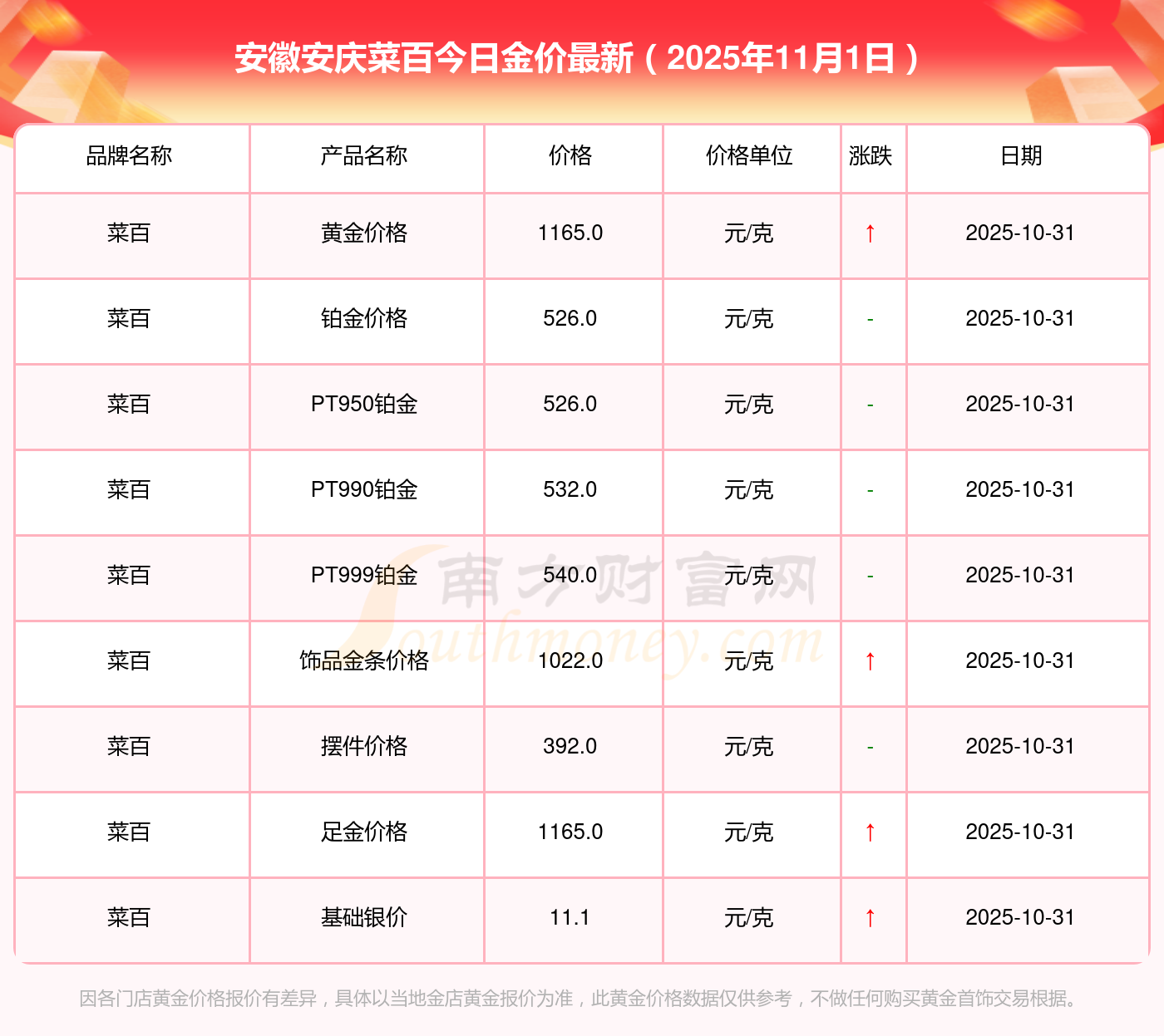 以上數(shù)據(jù)僅供參考,與當?shù)仄放粕獭⒔鸬、企業(yè)及銀行營業(yè)廳報價有所差異,依產(chǎn)品不同需另附工費,請以實際報價為準。本站對價格等不作任何保證或承諾,請自行核實相關(guān)內(nèi)容,因此所引起的后果與本站無關(guān)。