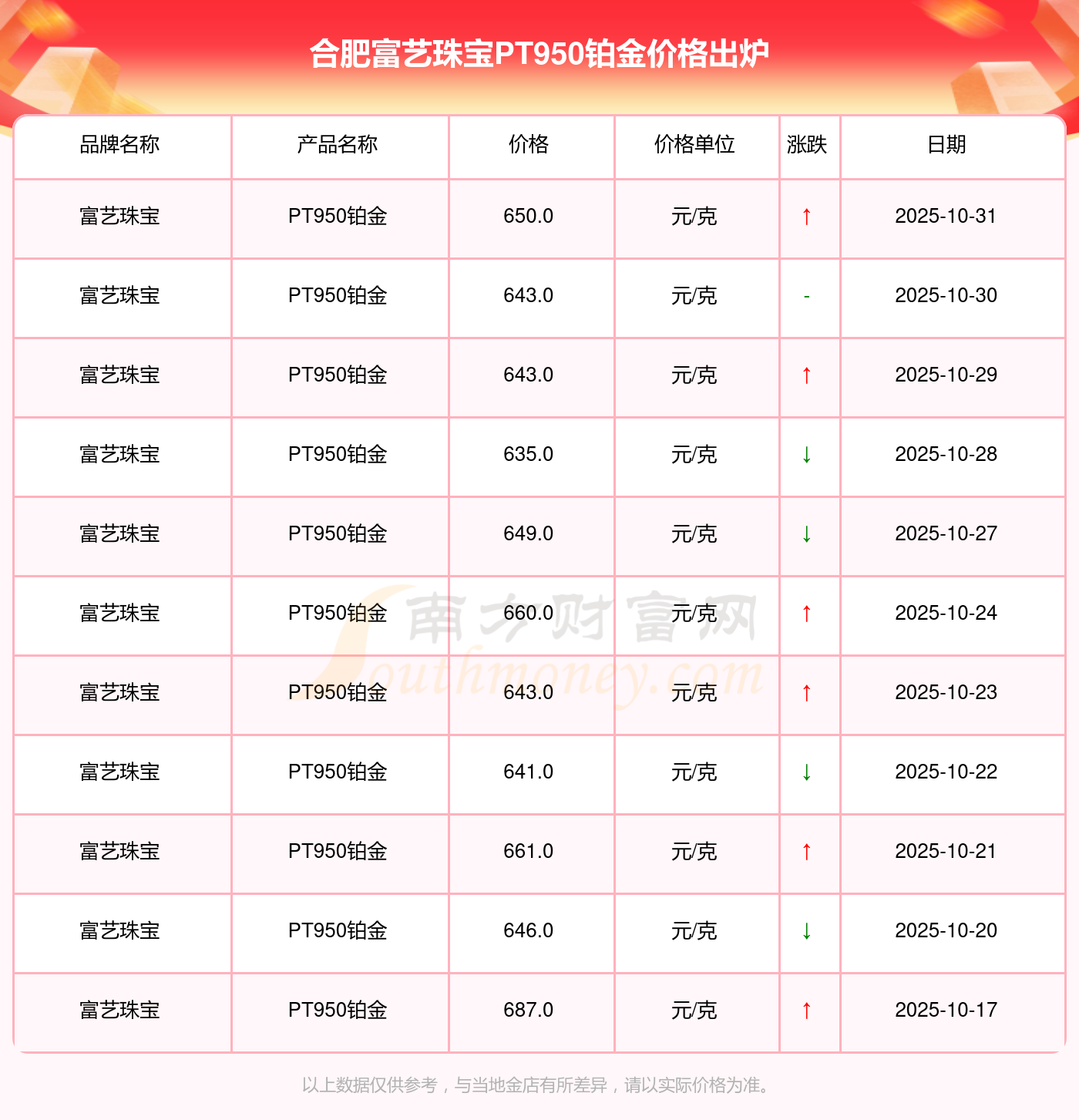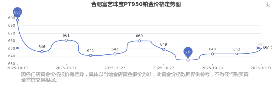 2025年11月1日合肥富藝珠寶PT950鉑金價格:650.0元/克。