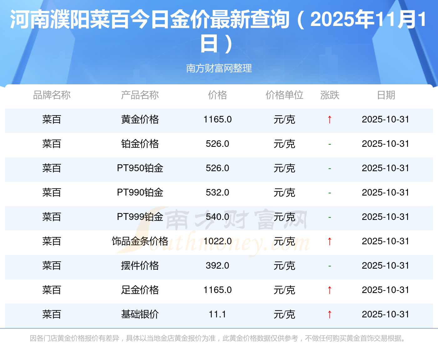 2025年11月1日河南濮陽菜百金價(jià)查詢:黃金價(jià)格1198.0元/克,鉑金價(jià)格650.0元/克,飾品金價(jià)(內(nèi)地)1198.0元/克,黃金飾品(香港)44660.0,鉑金價(jià)格(香港)18640.0,金條價(jià)格(香港)40080.0,金條金價(jià)(內(nèi)地)1058.0元/克,黃金價(jià)格1200.0元/克,鉑金價(jià)格560.0元/克,足金價(jià)格1200.0元/克,黃金價(jià)格1135.0元/克。
