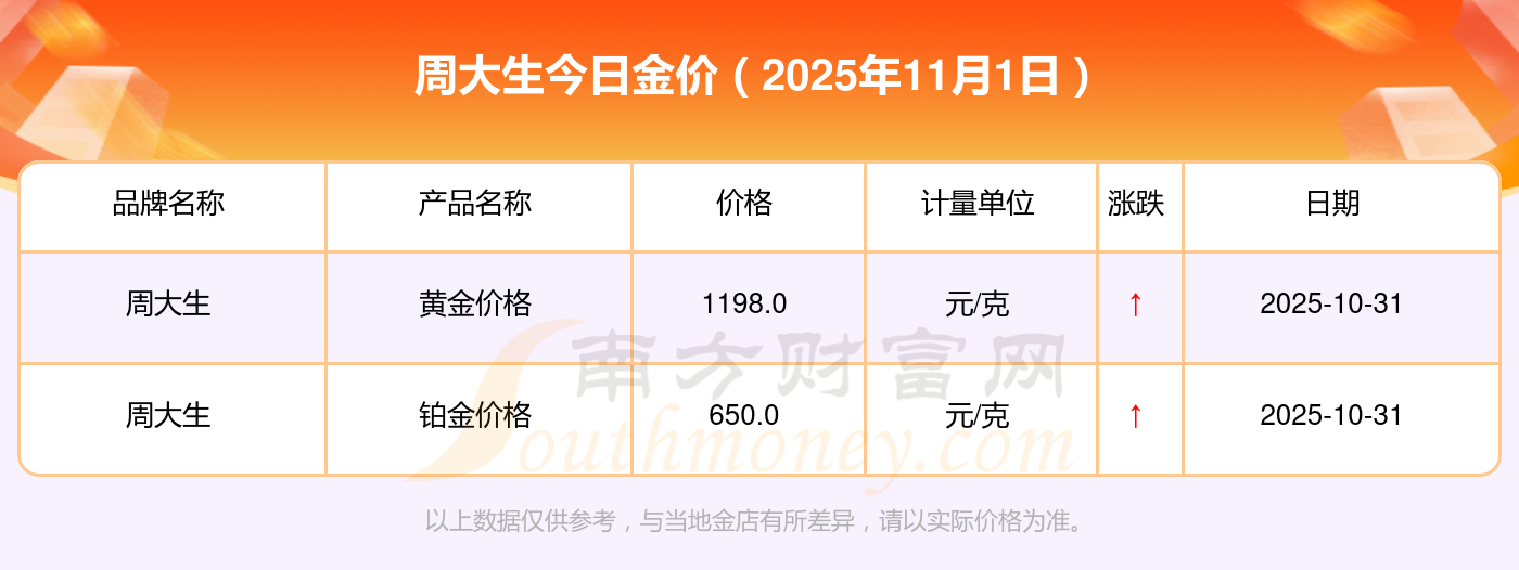 2025年11月1日周大生今日價格:黃金價格1198.0元/克,鉑金價格650.0元/克,飾品金價(內地)1198.0元/克,黃金飾品(香港)44660.0,鉑金價格(香港)18640.0,金條價格(香港)40080.0,金條金價(內地)1058.0元/克,黃金價格1200.0元/克,鉑金價格560.0元/克,足金價格1200.0元/克,黃金價格1135.0元/克。