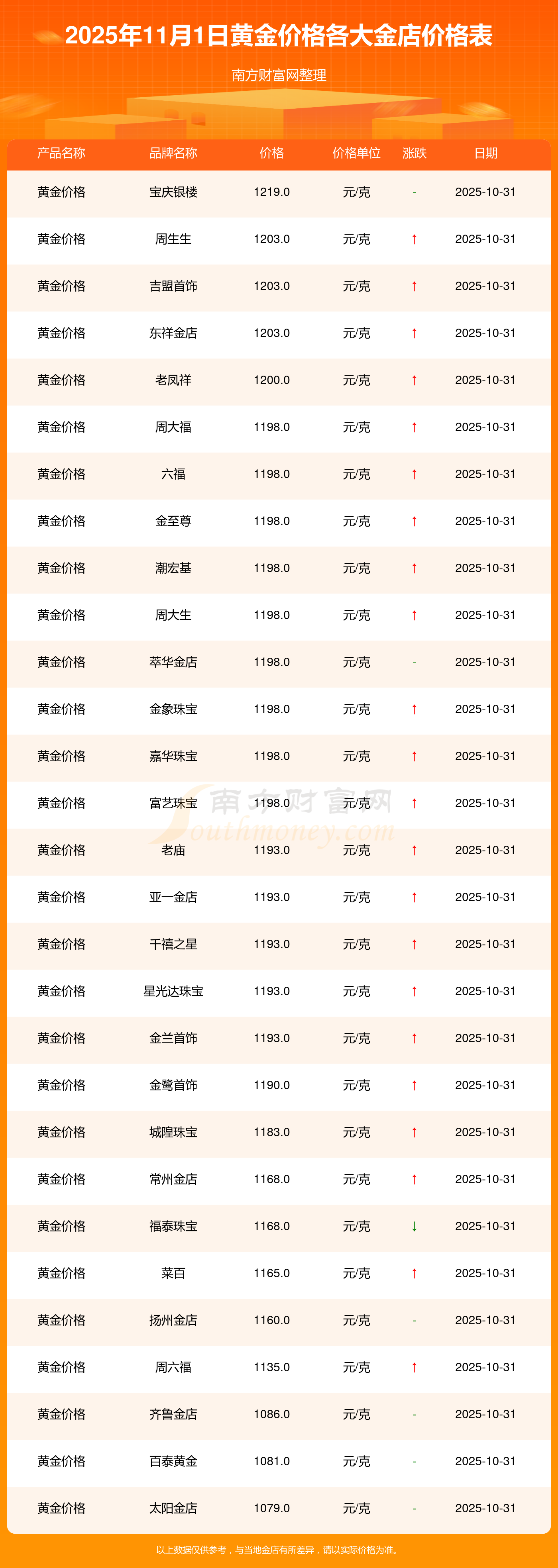 2025年11月1日各大金店黃金價格最新價格:周大福1198.0元/克,周大福650.0元/克,周大福1198.0元/克,周大福44660.0,周大福18640.0,周大福40080.0,周大福1058.0元/克,老鳳祥1200.0元/克,老鳳祥560.0元/克,老鳳祥1200.0元/克,周六福1135.0元/克。