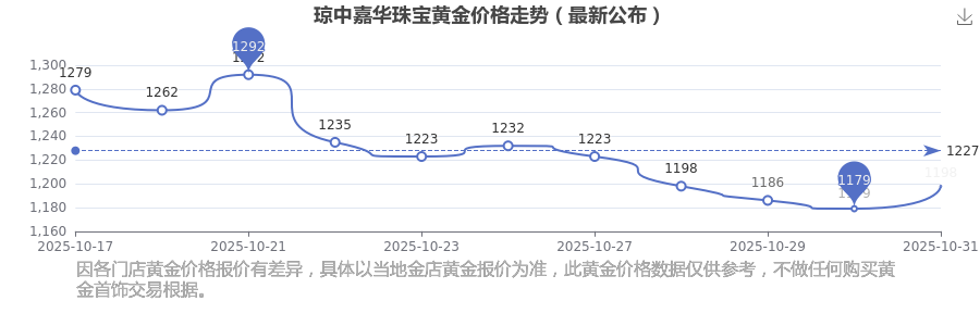 今日(2025年11月1日)瓊中嘉華珠寶黃金價格為1198.0元/克。