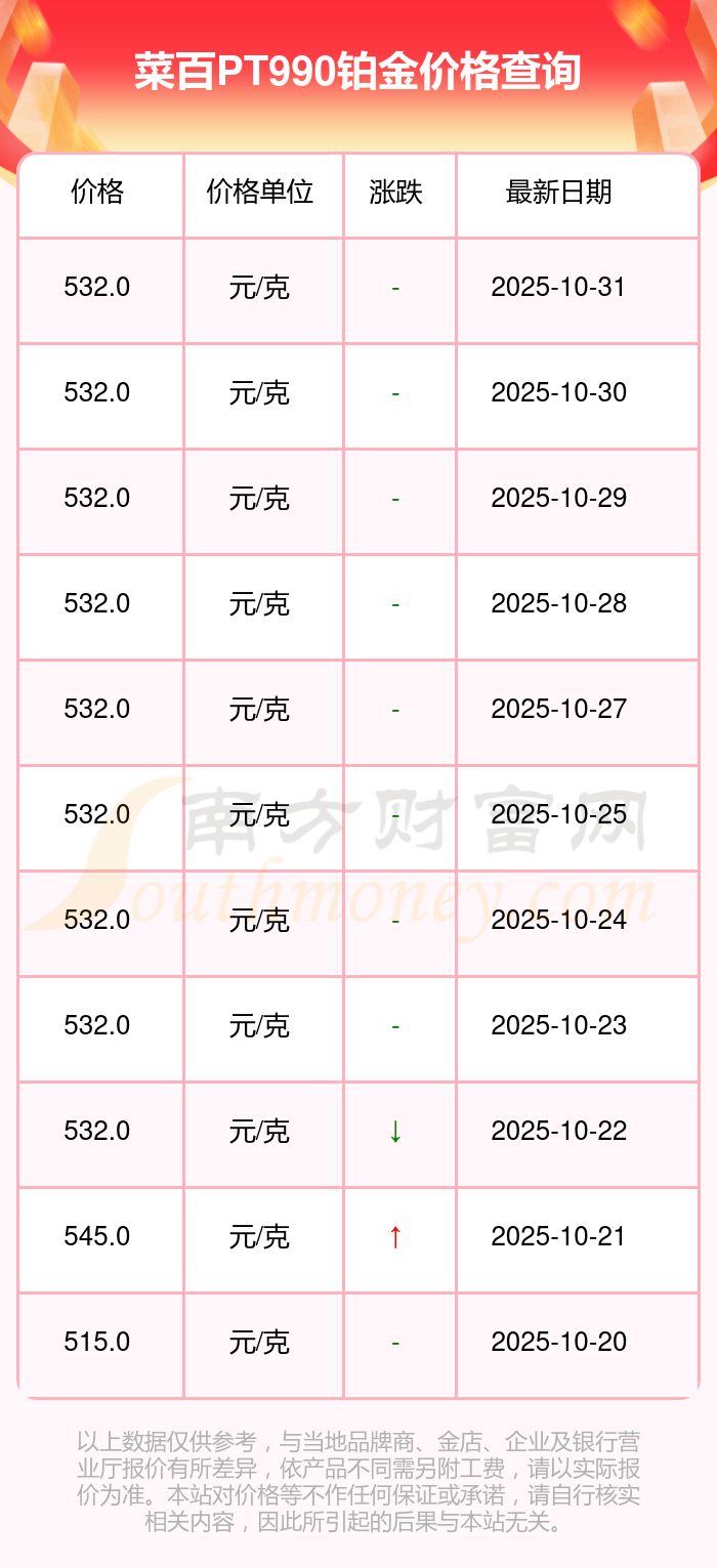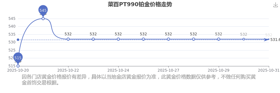 菜百 PT990鉑金在今日的最新價(jià)格顯示為532.0元/克。