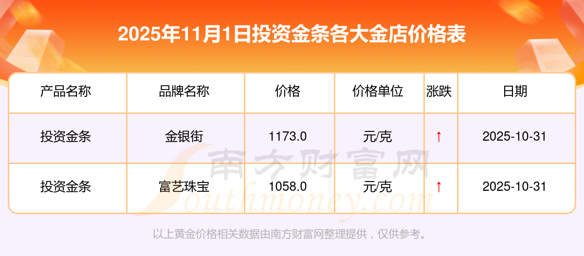 今天是2025年11月1日,周大福、周大福、周大福、周大福、周大福、周大福、周大福、老鳳祥、老鳳祥、老鳳祥、周六福等各大金店品牌投資金條最新價格如下:周大福1198.0元/克、周大福650.0元/克、周大福1198.0元/克、周大福44660.0、周大福18640.0、周大福40080.0、周大福1058.0元/克、老鳳祥1200.0元/克、老鳳祥560.0元/克、老鳳祥1200.0元/克、周六福1135.0元/克。