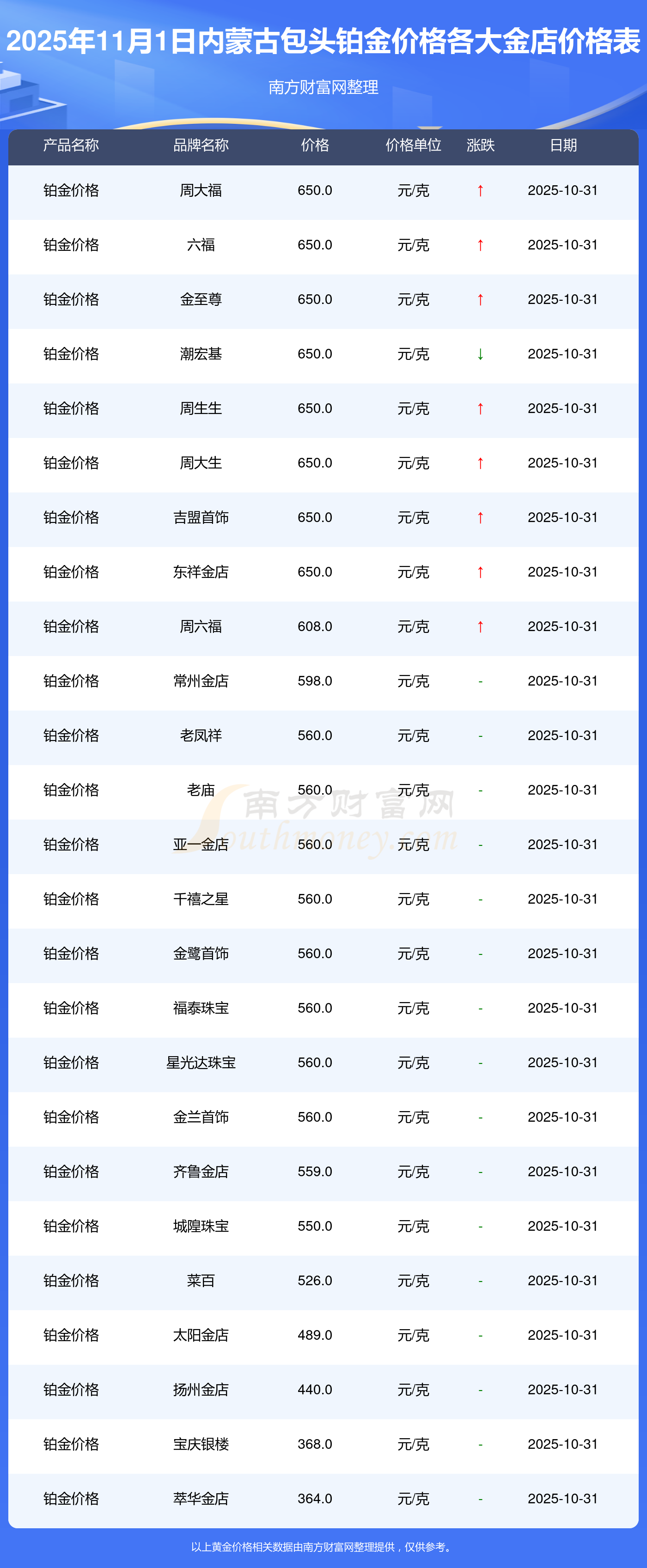2025年11月1日,內(nèi)蒙古包頭周大福、周大福、周大福、周大福、周大福、周大福、周大福、老鳳祥、老鳳祥、老鳳祥、周六福等各大金店品牌鉑金價(jià)格今日價(jià)格行情最新來了:周大福1198.0元/克、周大福650.0元/克、周大福1198.0元/克、周大福44660.0、周大福18640.0、周大福40080.0、周大福1058.0元/克、老鳳祥1200.0元/克、老鳳祥560.0元/克、老鳳祥1200.0元/克、周六福1135.0元/克。