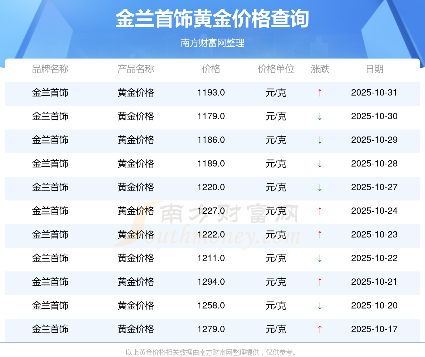 今日黃金價(jià)格查詢_現(xiàn)在金價(jià)黃金一克多少錢,黃金價(jià)格是多少錢一克?一般情況下1克黃金的價(jià)格會在多少呢?最新數(shù)據(jù)表明,金蘭首飾今日 黃金價(jià)格為1193.0元/克。