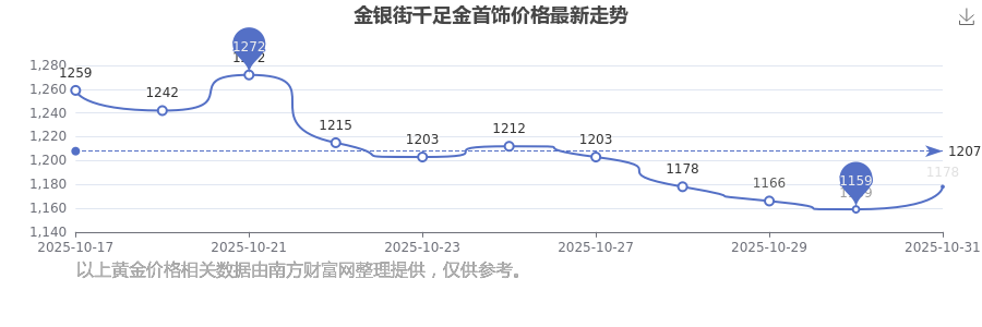 今日金銀街所公布的 千足金首飾最新價(jià)格為1178.0元/克。