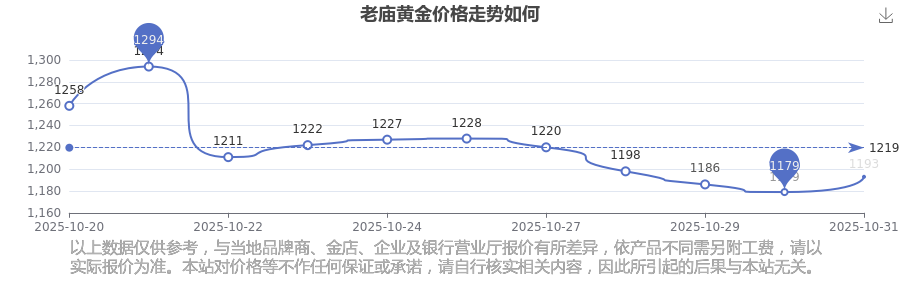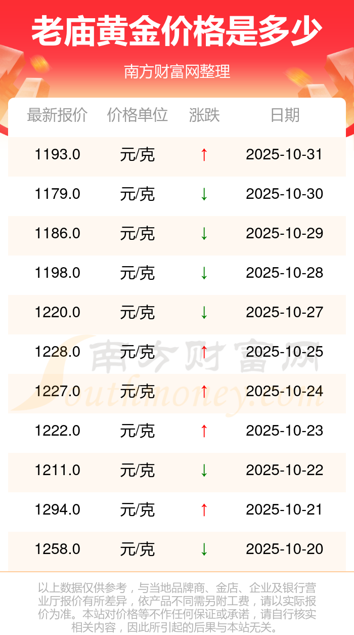 今日(2025年11月1日)老廟黃金價格是1193.0元/克。