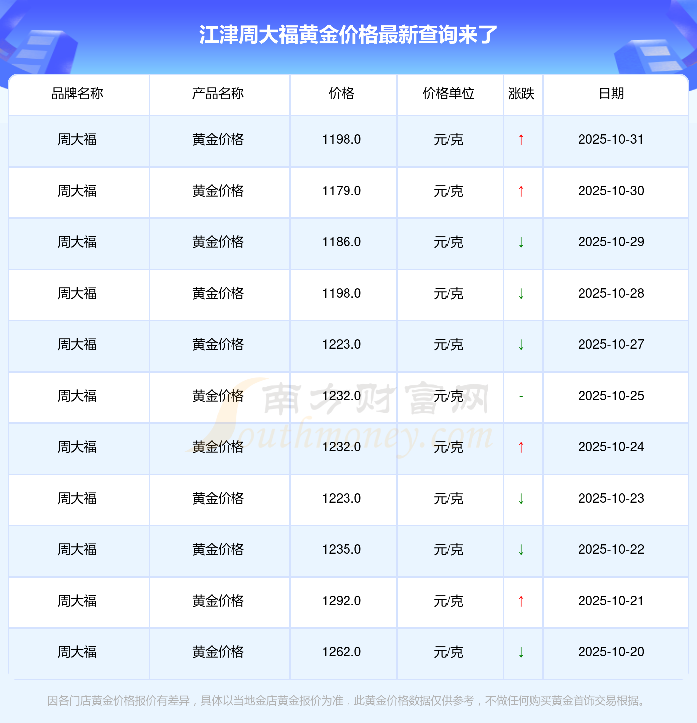 1198.0元/克的黃金價(jià)格,是江津周大福在 2025年11月1日給出的。