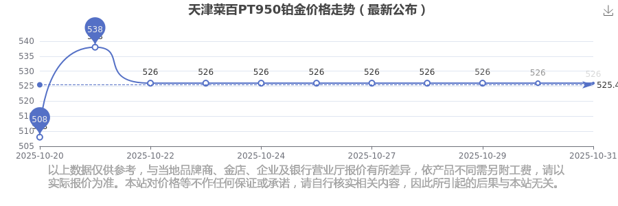 今日(2025年11月1日)天津菜百PT950鉑金價格是526.0元/克。