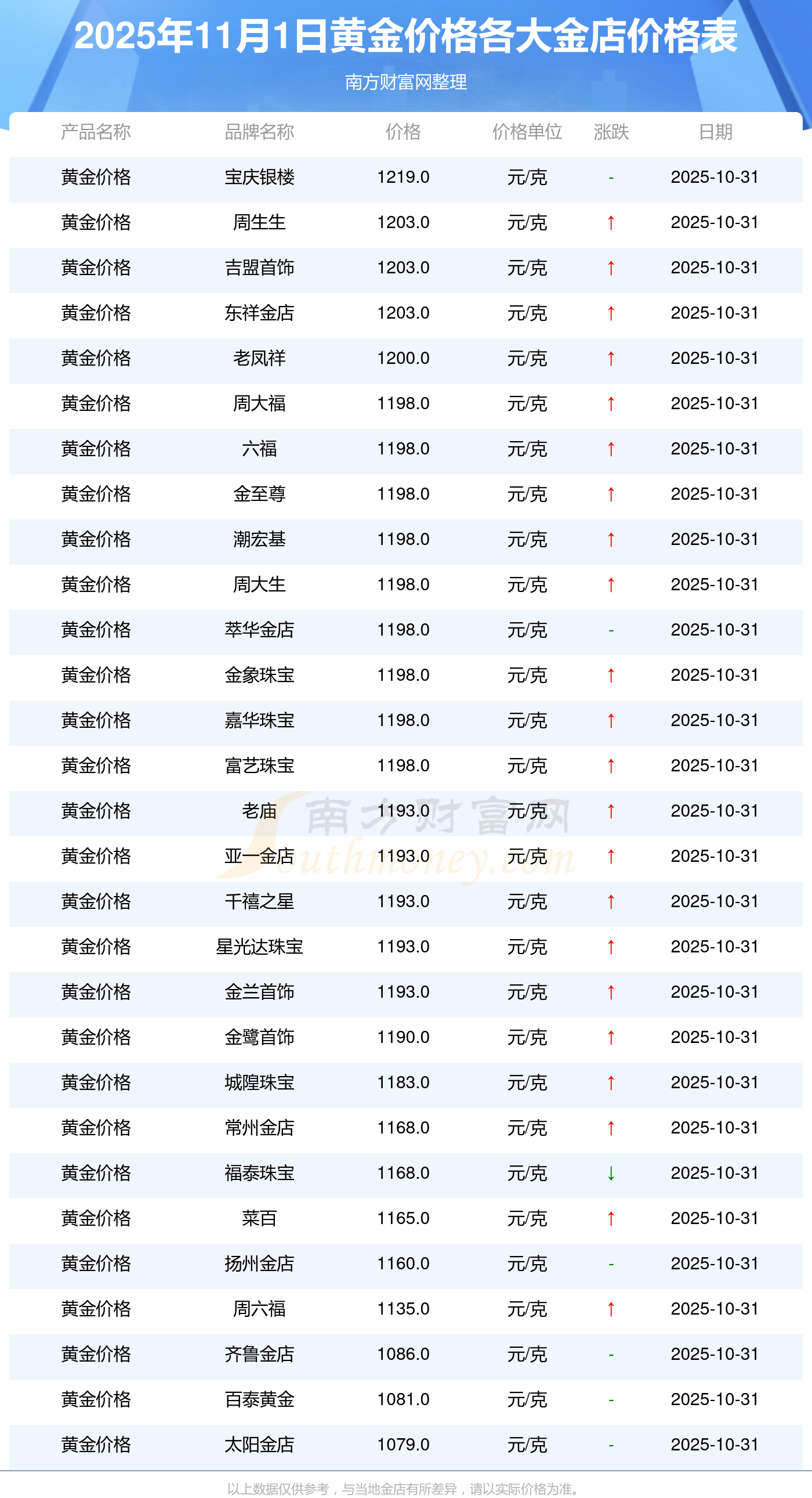 2025年11月1日各大金店黃金價格最新價格:周大福1198.0元/克,周大福650.0元/克,周大福1198.0元/克,周大福44660.0,周大福18640.0,周大福40080.0,周大福1058.0元/克,老鳳祥1200.0元/克,老鳳祥560.0元/克,老鳳祥1200.0元/克,周六福1135.0元/克。