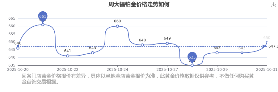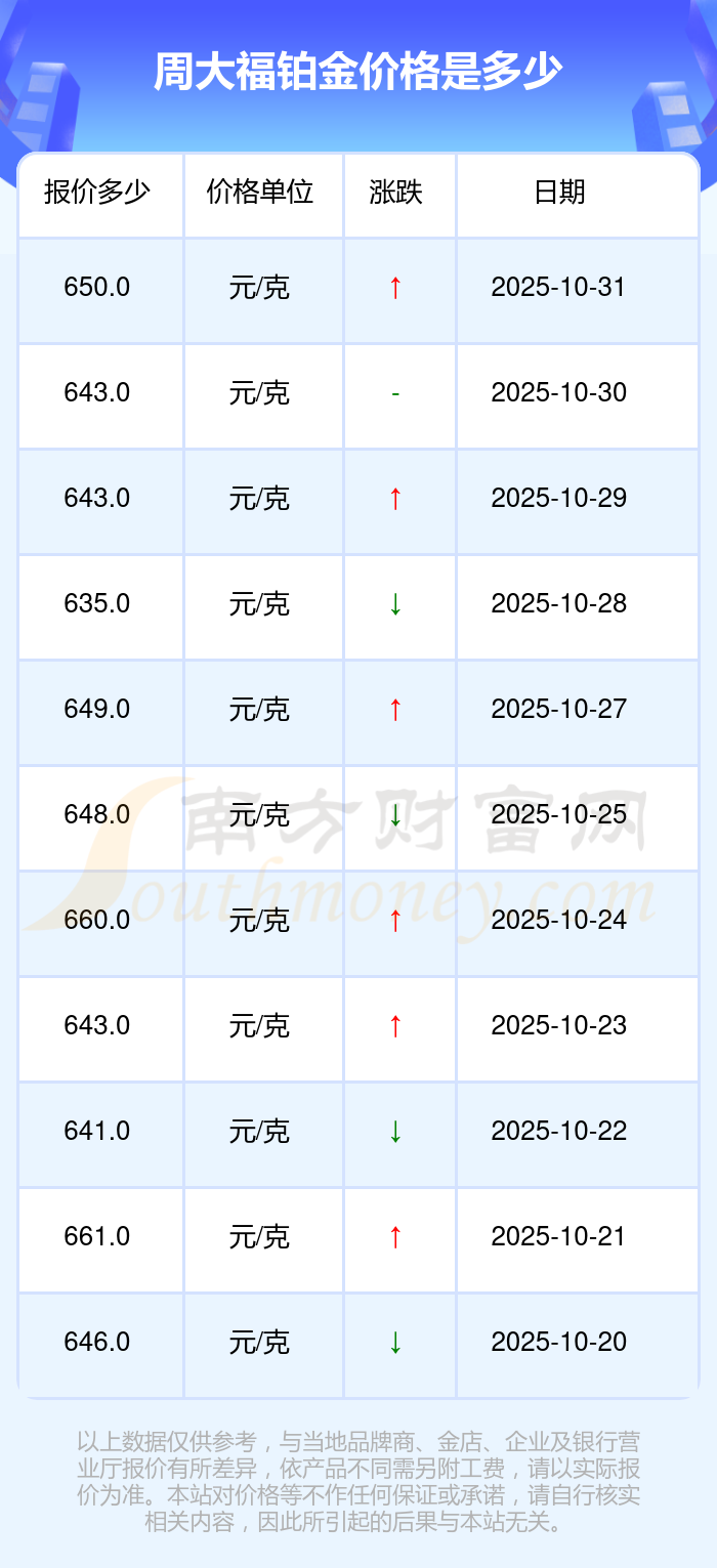 今日(2025年11月1日),周大福鉑金價格最新價格為650.0元/克。