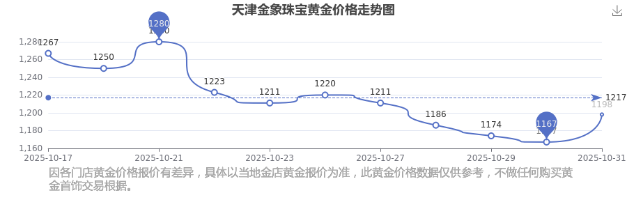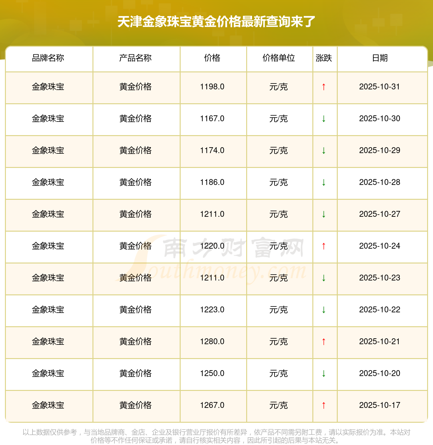天津金象珠寶現(xiàn)在黃金價(jià)格多少錢(qián)1克,請(qǐng)問(wèn)今天一克黃金值多少錢(qián)?今日天津金象珠寶黃金價(jià)格查詢(xún),今日2025年11月1日,天津金象珠寶黃金價(jià)格為1198.0元/克。