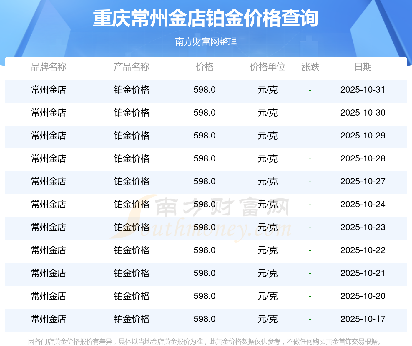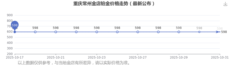2025年11月1日重慶常州金店鉑金價(jià)格:598.0元/克。
