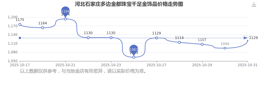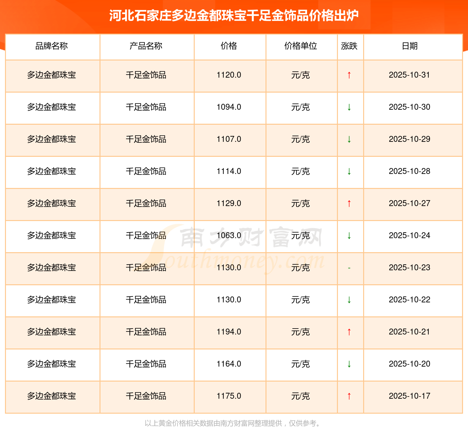 今日河北石家莊多邊金都珠寶千足金飾品價格為1120.0元/克。
