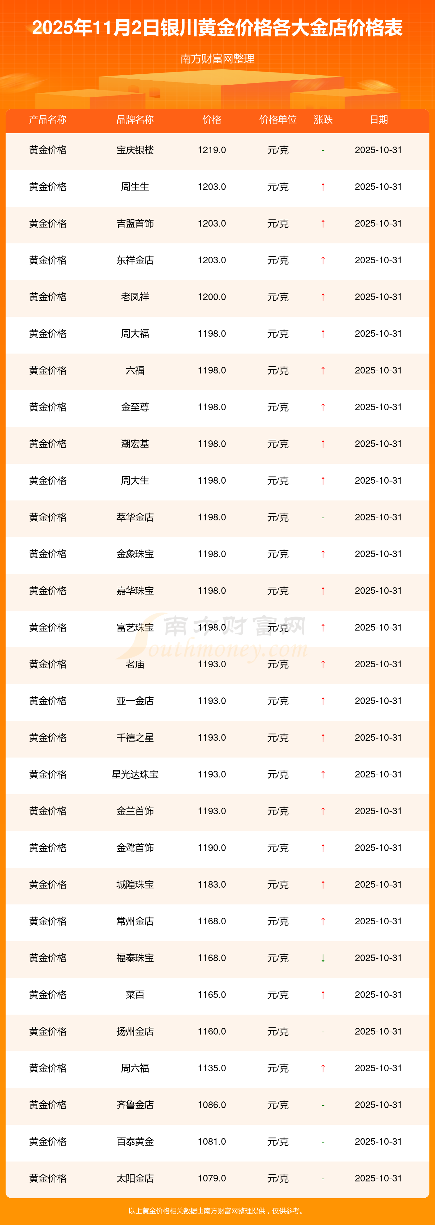 2025年11月2日銀川周大福、周大福、周大福、周大福、周大福、周大福、周大福、老鳳祥、老鳳祥、老鳳祥、周六福等各大金店品牌黃金價(jià)格最新價(jià)格如下:周大福黃金價(jià)格1198.0元/克,周大福鉑金價(jià)格650.0元/克,周大福飾品金價(jià)(內(nèi)地)1198.0元/克,周大福黃金飾品(香港)44660.0,周大福鉑金價(jià)格(香港)18640.0,周大福金條價(jià)格(香港)40080.0,周大福金條金價(jià)(內(nèi)地)1058.0元/克,老鳳祥黃金價(jià)格1200.0元/克,老鳳祥鉑金價(jià)格560.0元/克,老鳳祥足金價(jià)格1200.0元/克,周六福黃金價(jià)格1135.0元/克。