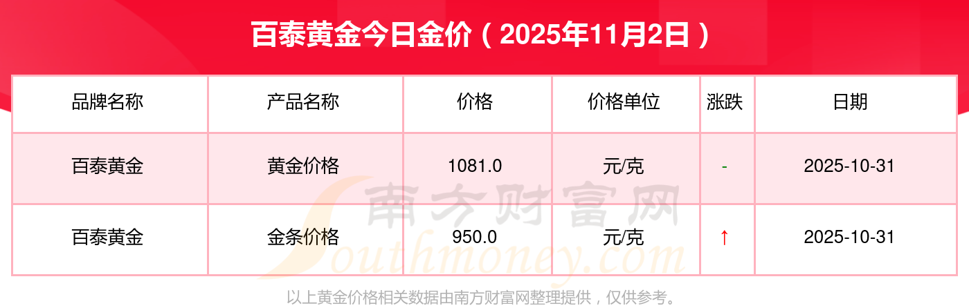 百泰黃金現(xiàn)在金價(jià)多少錢一克?百泰黃金今天黃金價(jià)格多少一克?最新百泰黃金查詢,2025年11月2日百泰黃金黃金價(jià)格現(xiàn)在每克多少錢?最新百泰黃金黃金價(jià)格報(bào)價(jià)公布,一起來看看吧!