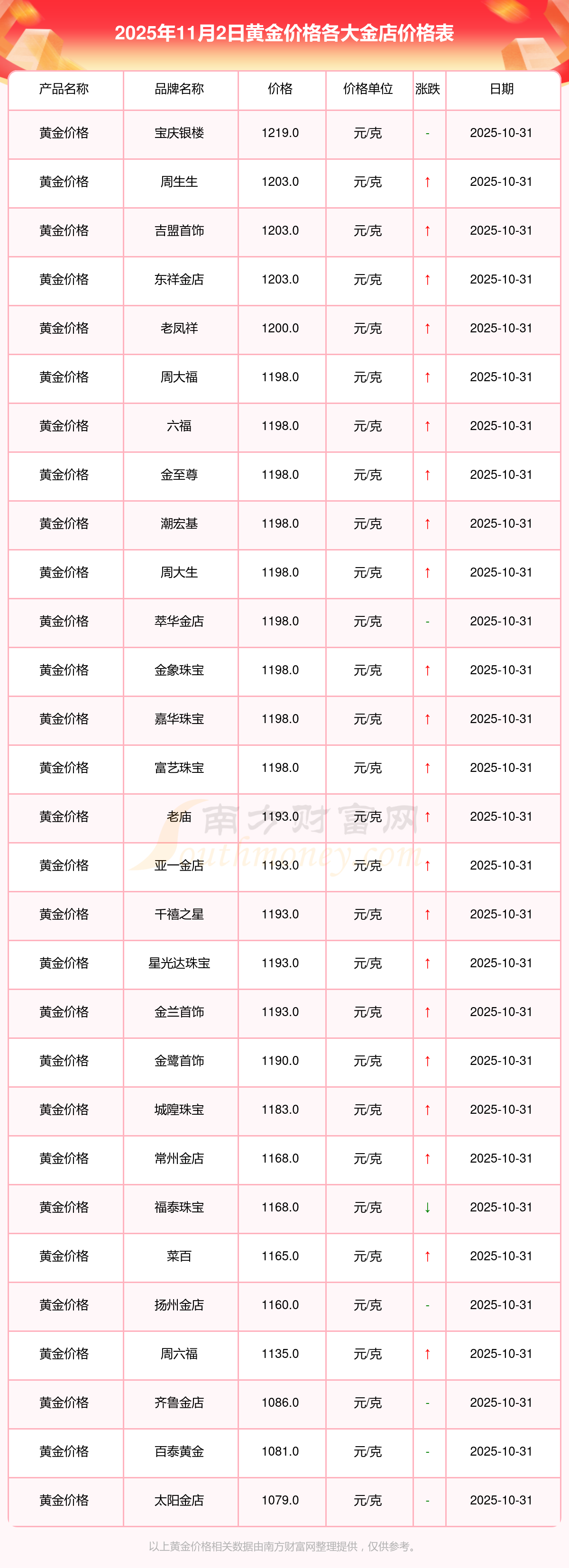 2025年11月2日,周大福、周大福、周大福、周大福、周大福、周大福、周大福、老鳳祥、老鳳祥、老鳳祥、周六福等各大金店品牌黃金價(jià)格今日價(jià)格如下:周大福1198.0元/克、周大福650.0元/克、周大福1198.0元/克、周大福44660.0、周大福18640.0、周大福40080.0、周大福1058.0元/克、老鳳祥1200.0元/克、老鳳祥560.0元/克、老鳳祥1200.0元/克、周六福1135.0元/克。
