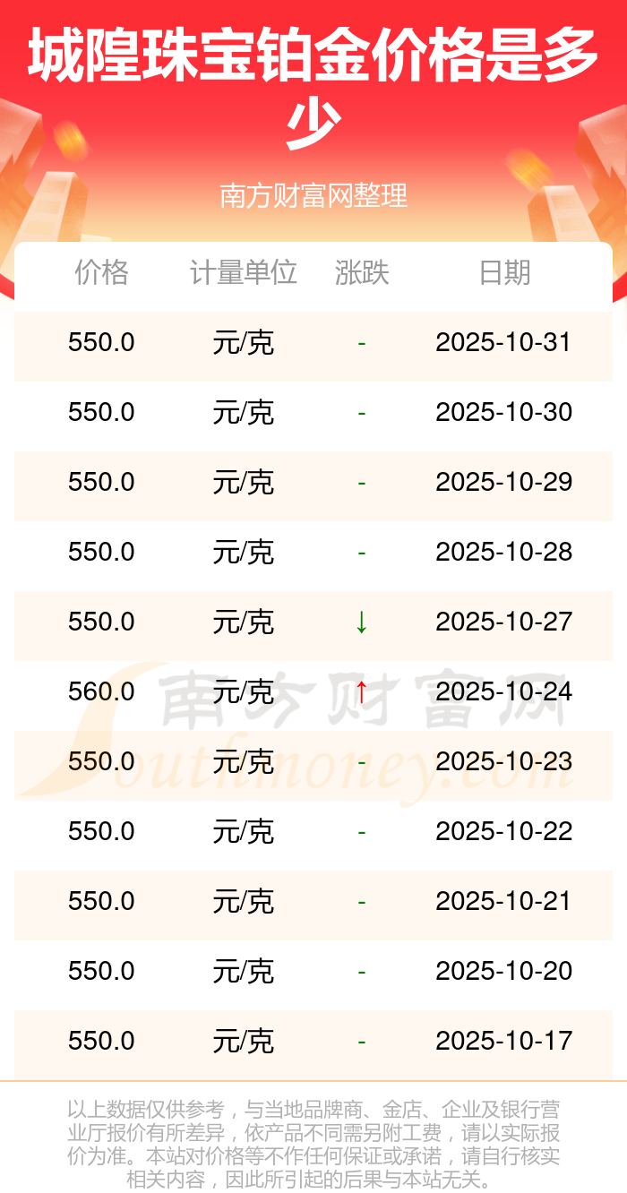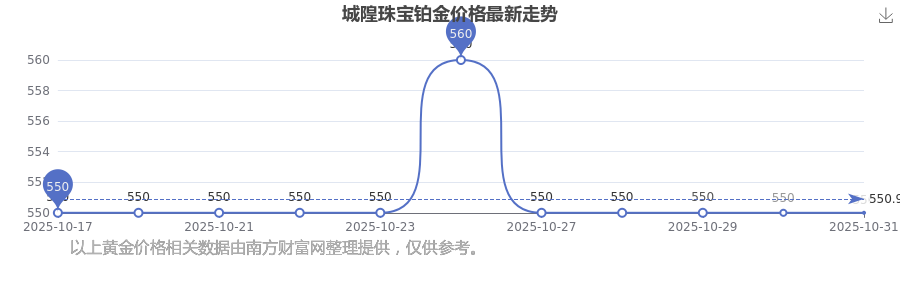 今日城隍珠寶 鉑金價(jià)格的最新定價(jià)為550.0元/克。