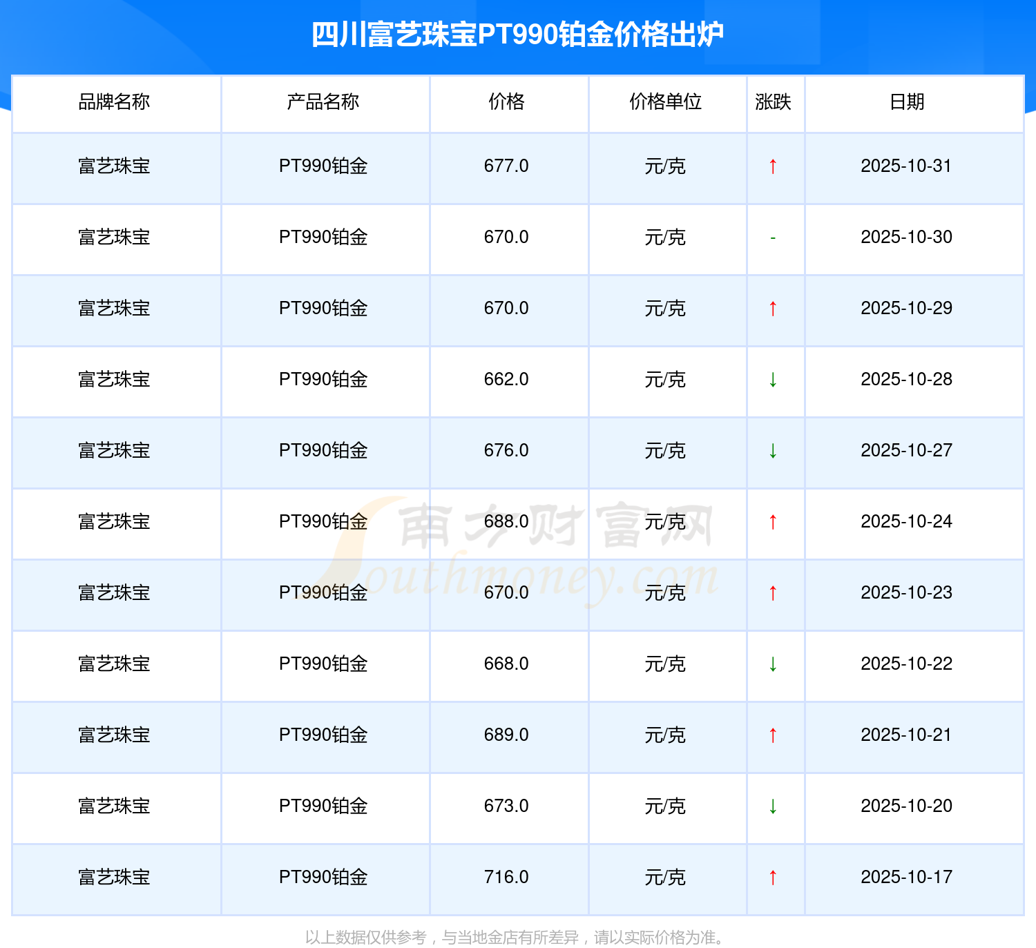 2025年11月2日周大福、周大福、周大福、周大福、周大福、周大福、周大福、老鳳祥、老鳳祥、老鳳祥、周六福等各大金店品牌PT990鉑金最新價(jià)格如下:周大福黃金價(jià)格1198.0元/克,周大福鉑金價(jià)格650.0元/克,周大福飾品金價(jià)(內(nèi)地)1198.0元/克,周大福黃金飾品(香港)44660.0,周大福鉑金價(jià)格(香港)18640.0,周大福金條價(jià)格(香港)40080.0,周大福金條金價(jià)(內(nèi)地)1058.0元/克,老鳳祥黃金價(jià)格1200.0元/克,老鳳祥鉑金價(jià)格560.0元/克,老鳳祥足金價(jià)格1200.0元/克,周六福黃金價(jià)格1135.0元/克。