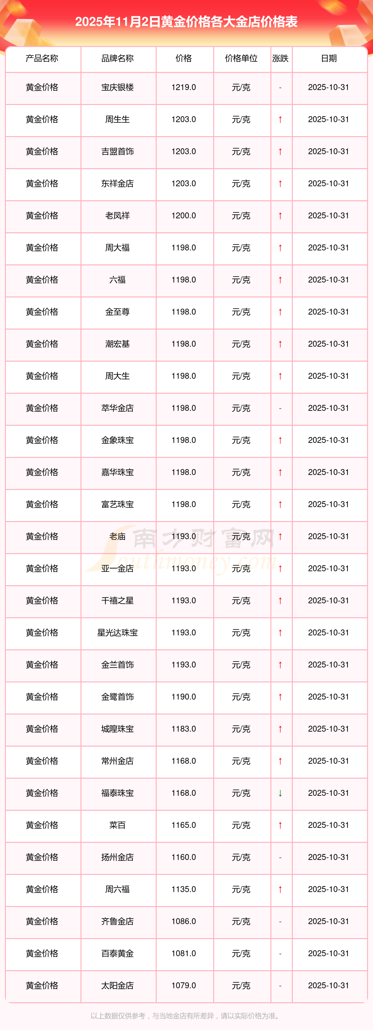 2025年11月2日,周大福、周大福、周大福、周大福、周大福、周大福、周大福、老鳳祥、老鳳祥、老鳳祥、周六福等各大金店品牌黃金價(jià)格今日價(jià)格如下:周大福1198.0元/克、周大福650.0元/克、周大福1198.0元/克、周大福44660.0、周大福18640.0、周大福40080.0、周大福1058.0元/克、老鳳祥1200.0元/克、老鳳祥560.0元/克、老鳳祥1200.0元/克、周六福1135.0元/克。