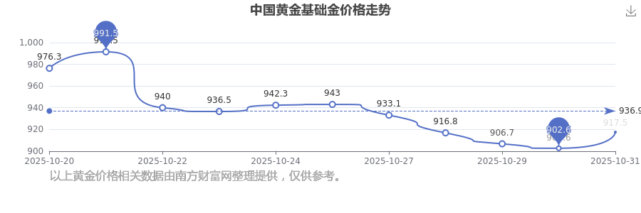 今日中國黃金基礎(chǔ)金價格:917.5元/克。