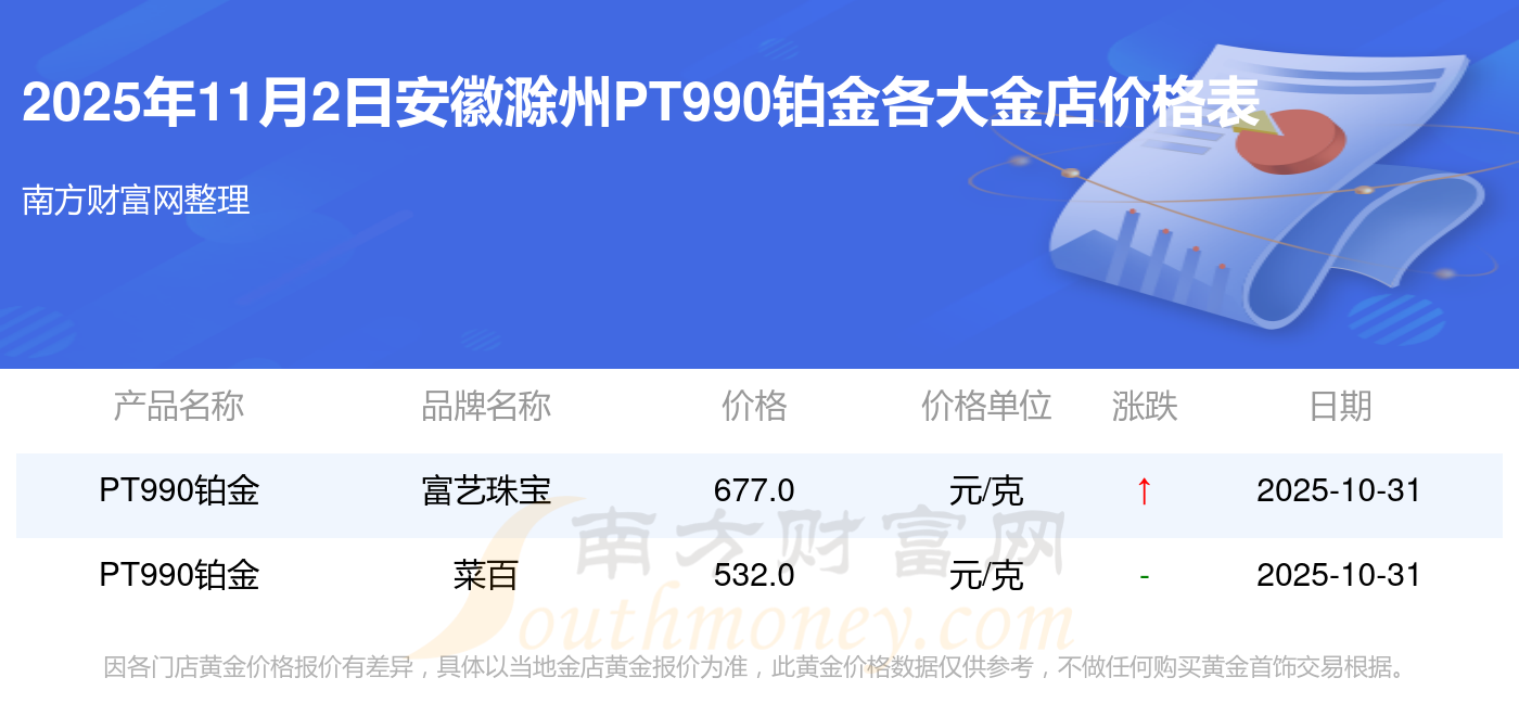 2025年11月2日安徽滁州各大金店P(guān)T990鉑金最新價(jià)格:周大福1198.0元/克,周大福650.0元/克,周大福1198.0元/克,周大福44660.0,周大福18640.0,周大福40080.0,周大福1058.0元/克,老鳳祥1200.0元/克,老鳳祥560.0元/克,老鳳祥1200.0元/克,周六福1135.0元/克。