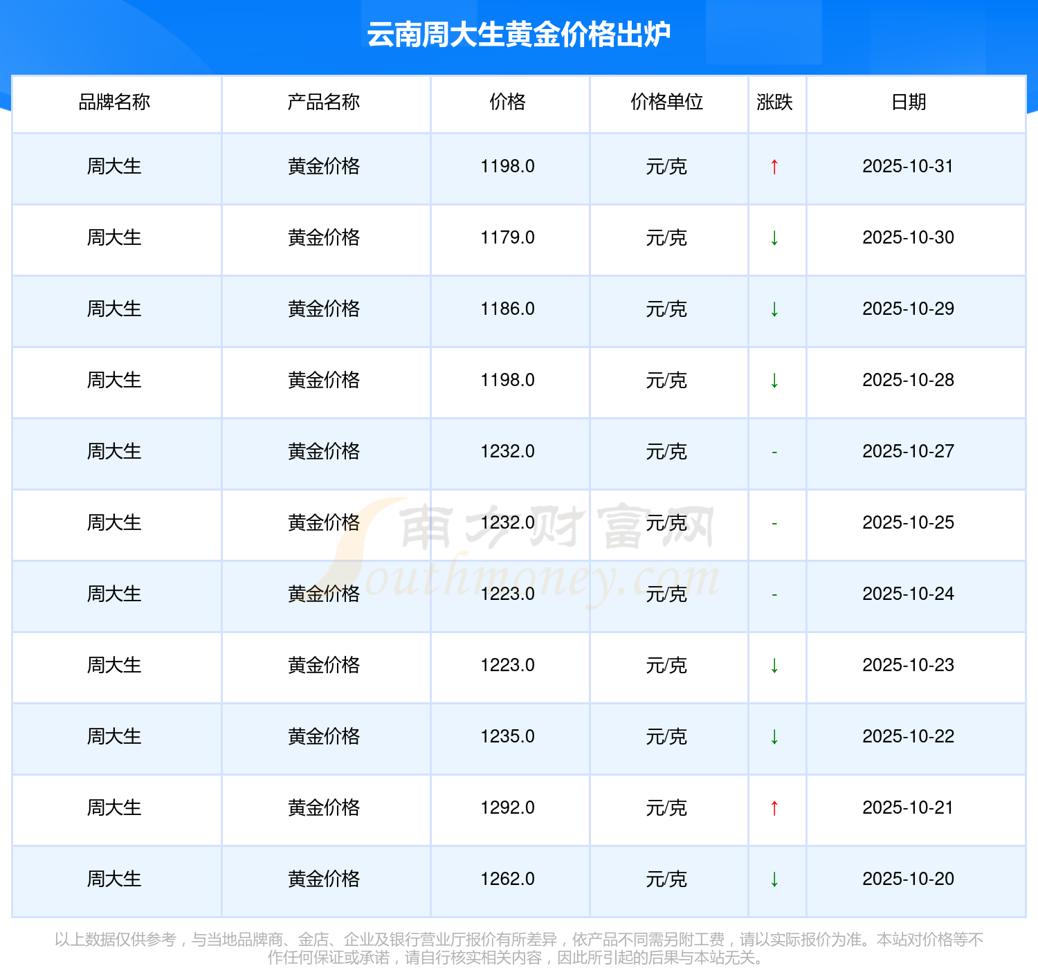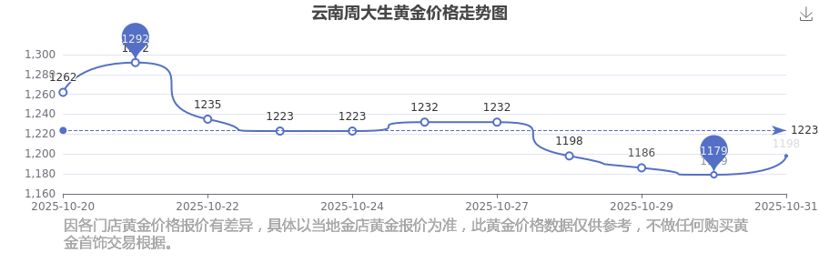 2025年11月2日云南周大生黃金價格:1198.0元/克。