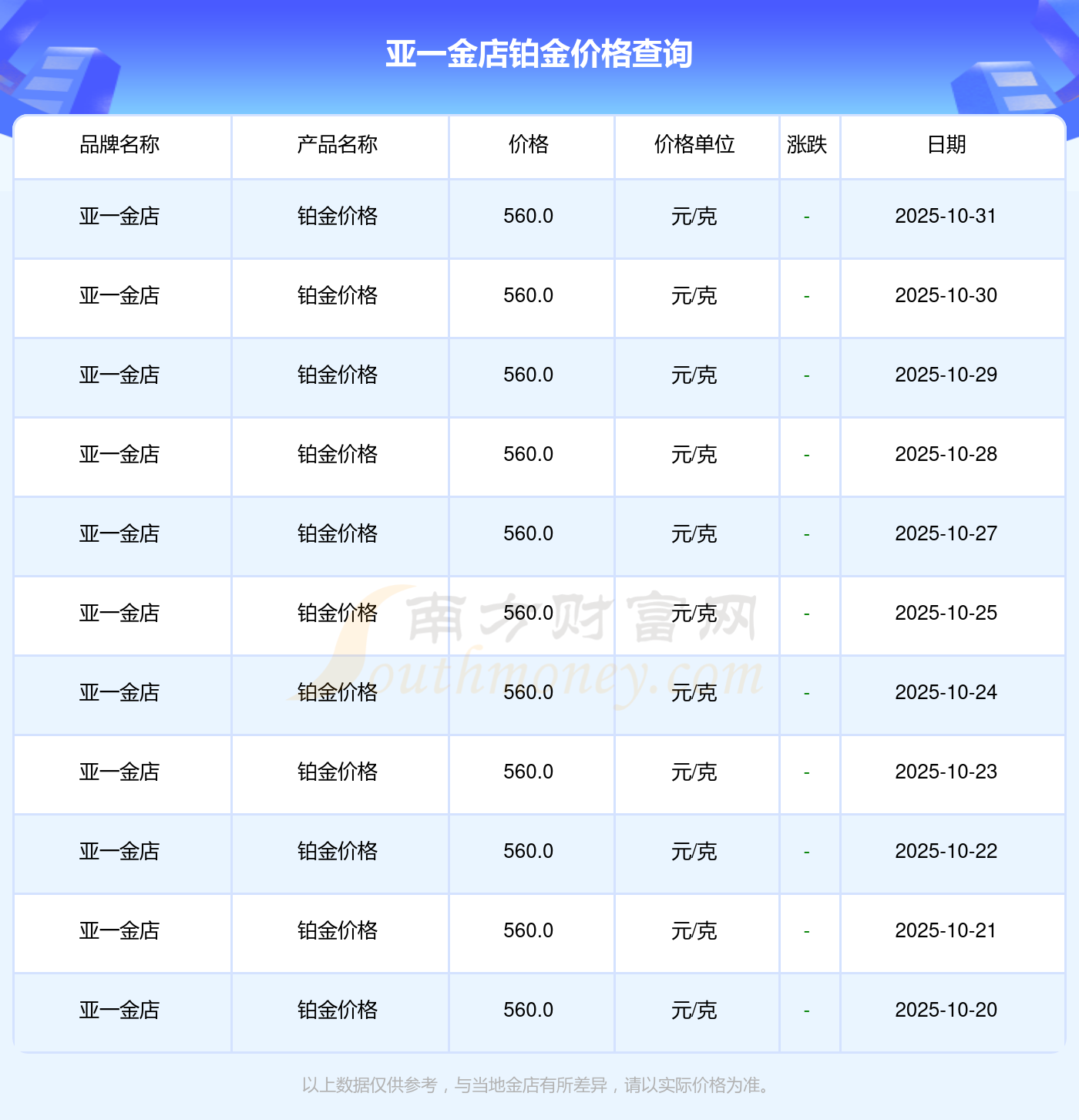 亞一金店今日 鉑金價格的最新市場行情價為560.0元/克。