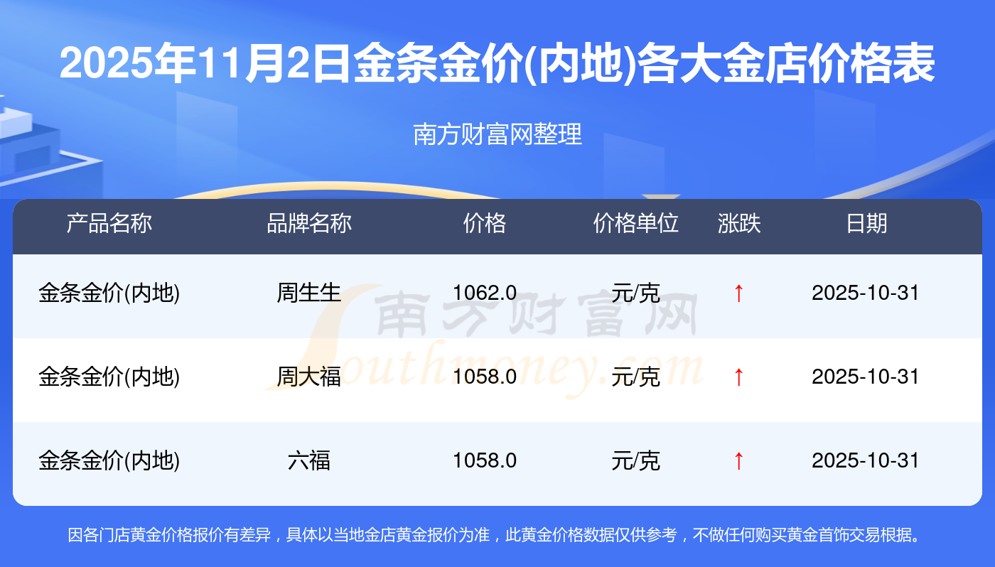 2025年11月2日,周大福、周大福、周大福、周大福、周大福、周大福、周大福、老鳳祥、老鳳祥、老鳳祥、周六福等各大金店品牌金條金價(內地)今日價格如下:周大福1198.0元/克、周大福650.0元/克、周大福1198.0元/克、周大福44660.0、周大福18640.0、周大福40080.0、周大福1058.0元/克、老鳳祥1200.0元/克、老鳳祥560.0元/克、老鳳祥1200.0元/克、周六福1135.0元/克。