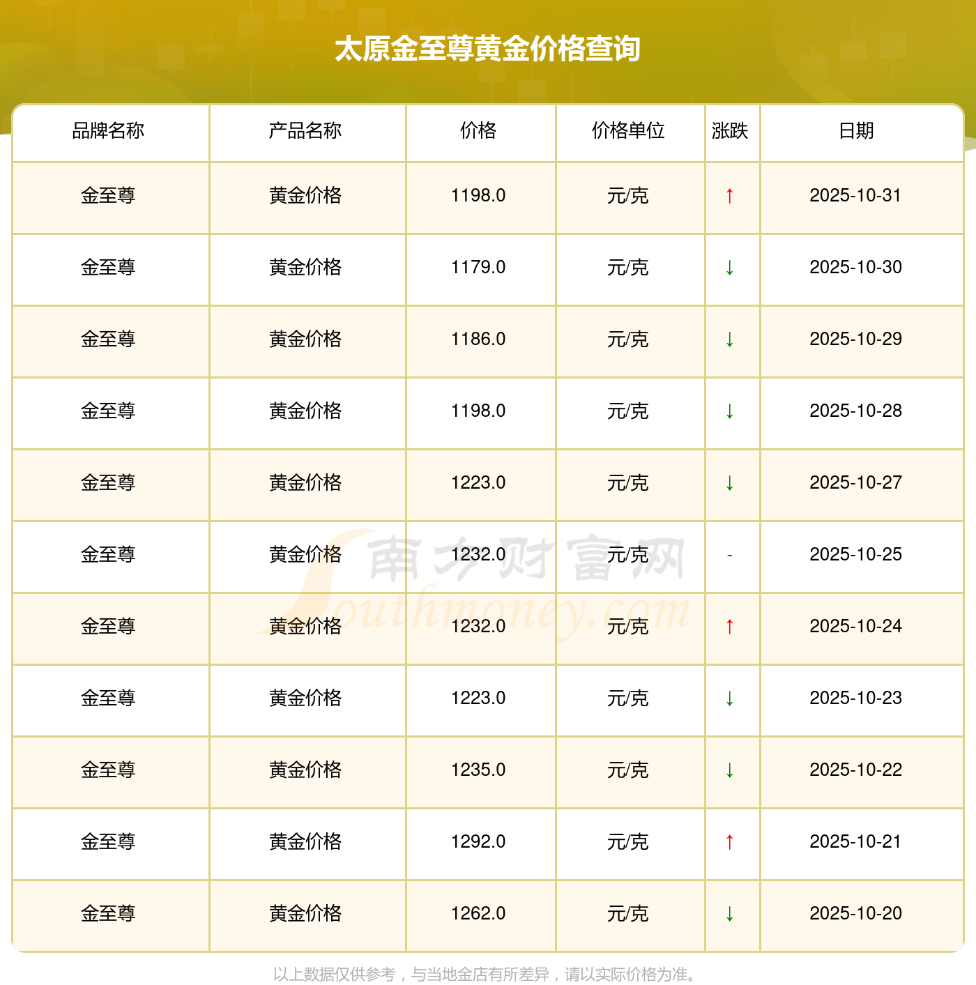 以上數(shù)據(jù)僅供參考,與當(dāng)?shù)仄放粕、金店、企業(yè)及銀行營業(yè)廳報(bào)價(jià)有所差異,依產(chǎn)品不同需另附工費(fèi),請以實(shí)際報(bào)價(jià)為準(zhǔn)。本站對價(jià)格等不作任何保證或承諾,請自行核實(shí)相關(guān)內(nèi)容,因此所引起的后果與本站無關(guān)。