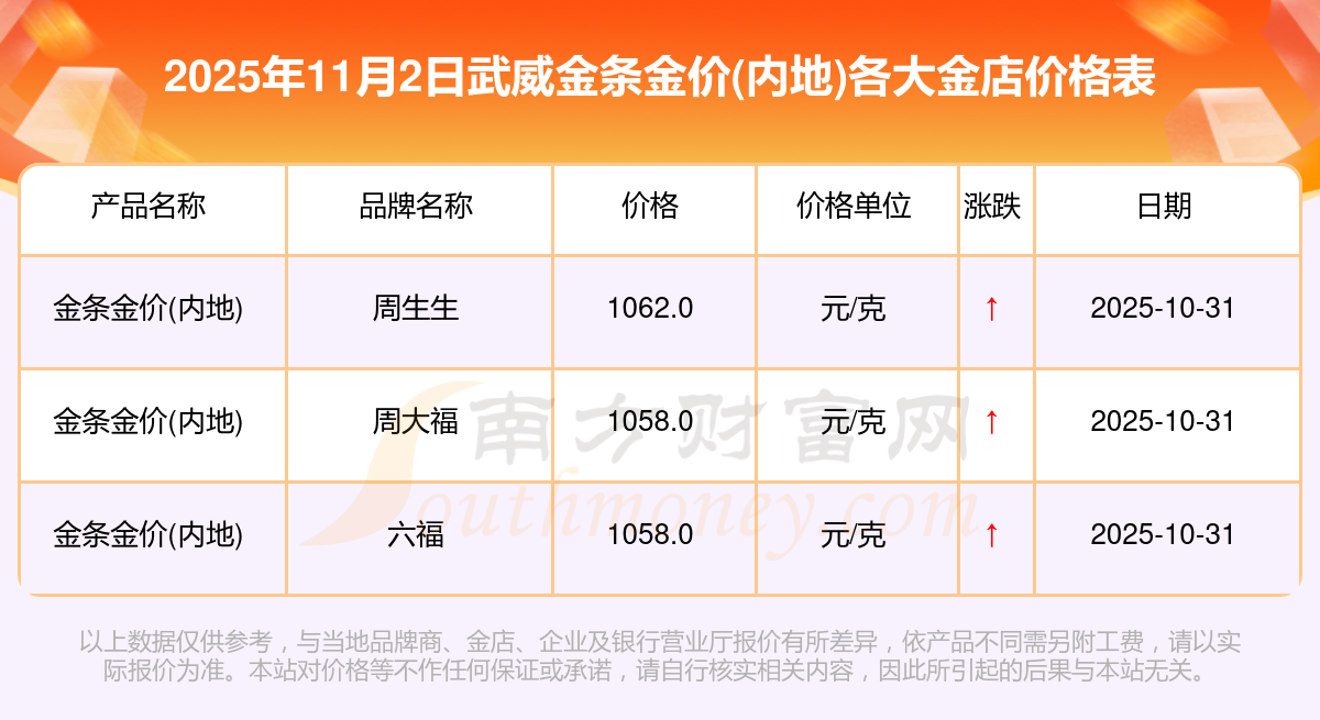2025年11月2日武威各大金店金條金價(jià)(內(nèi)地)最新價(jià)格查詢來了:周大福1198.0元/克,周大福650.0元/克,周大福1198.0元/克,周大福44660.0,周大福18640.0,周大福40080.0,周大福1058.0元/克,老鳳祥1200.0元/克,老鳳祥560.0元/克,老鳳祥1200.0元/克,周六福1135.0元/克。