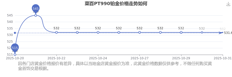 今日(2025年11月2日),菜百PT990鉑金最新價格是532.0元/克。