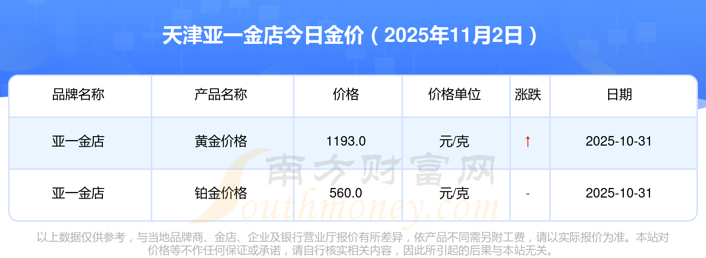 2025年11月2日天津亞一金店一克黃金的售價是多少:黃金價格1198.0元/克,鉑金價格650.0元/克,飾品金價(內(nèi)地)1198.0元/克,黃金飾品(香港)44660.0,鉑金價格(香港)18640.0,金條價格(香港)40080.0,金條金價(內(nèi)地)1058.0元/克,黃金價格1200.0元/克,鉑金價格560.0元/克,足金價格1200.0元/克,黃金價格1135.0元/克。