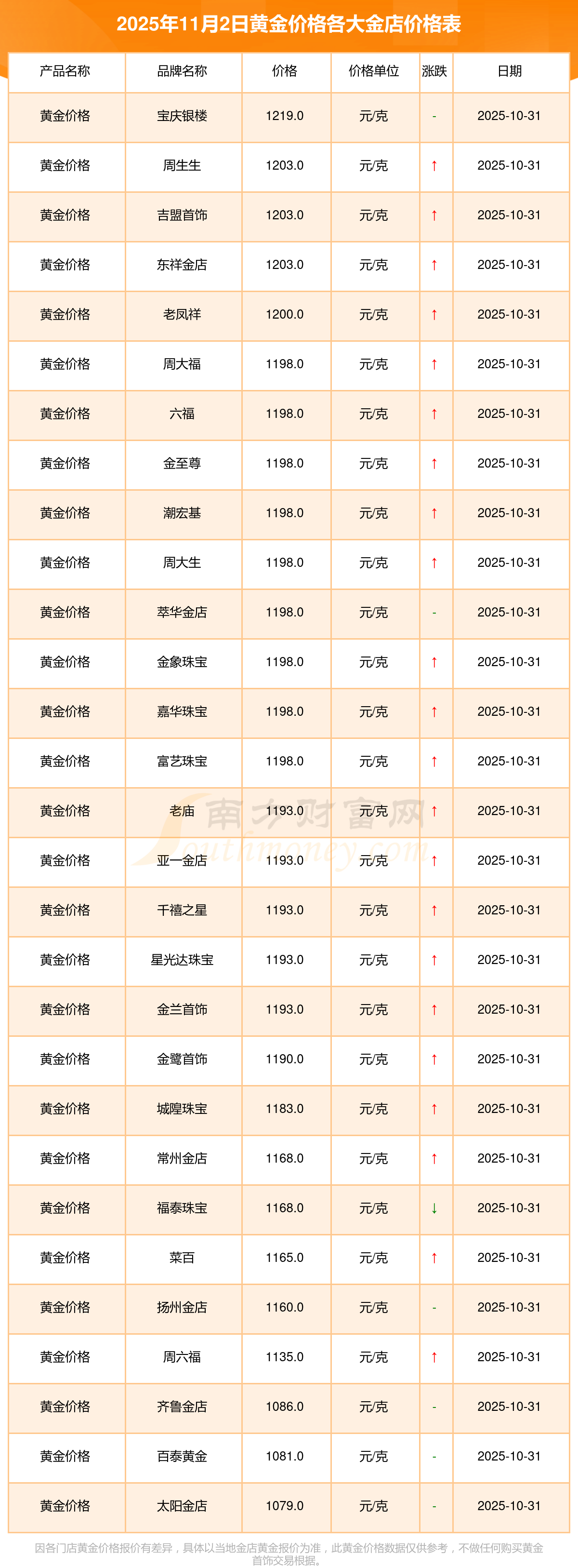 2025年11月2日各大金店黃金價格最新價格:周大福1198.0元/克,周大福650.0元/克,周大福1198.0元/克,周大福44660.0,周大福18640.0,周大福40080.0,周大福1058.0元/克,老鳳祥1200.0元/克,老鳳祥560.0元/克,老鳳祥1200.0元/克,周六福1135.0元/克。