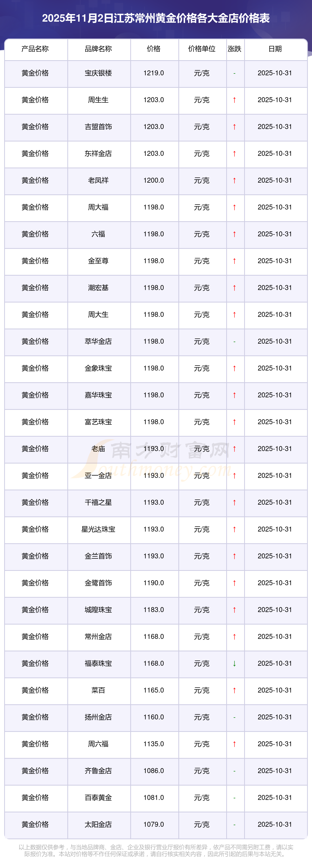 2025年11月2日,江蘇常州周大福、周大福、周大福、周大福、周大福、周大福、周大福、老鳳祥、老鳳祥、老鳳祥、周六福等各大金店品牌黃金價(jià)格今日價(jià)格行情最新來了:周大福1198.0元/克、周大福650.0元/克、周大福1198.0元/克、周大福44660.0、周大福18640.0、周大福40080.0、周大福1058.0元/克、老鳳祥1200.0元/克、老鳳祥560.0元/克、老鳳祥1200.0元/克、周六福1135.0元/克。