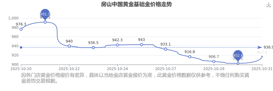 今日房山中國黃金基礎(chǔ)金價格:917.5元/克。